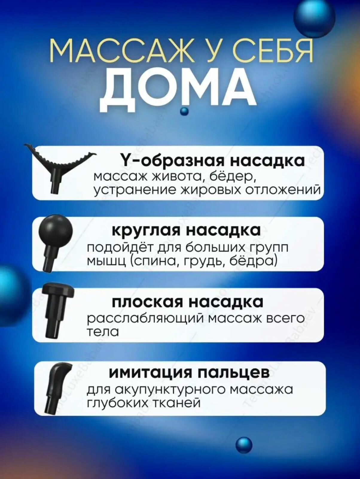 | Вид массажа | акупунктурный / вибрационный / комбинированный / лимфодренажный / перкуссионный |