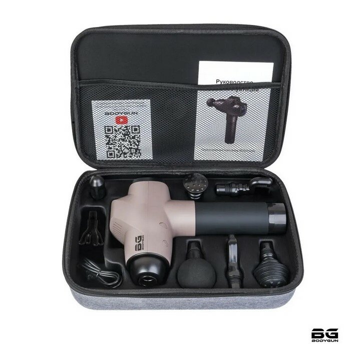 | Подробная комплектация | Картонная коробка, Бокс для хранения с молнией, Массажный пистолет, 6 сменных насадок, Кабель питания USB-Type-c, Инструкция на русском языке |