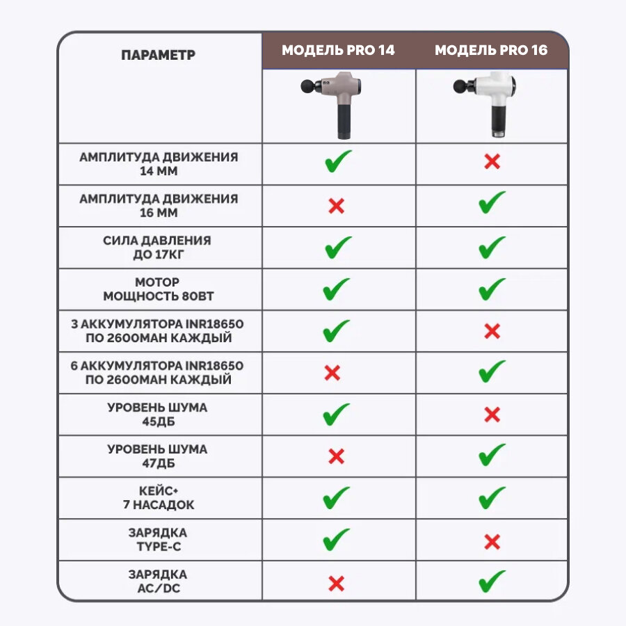 | Дополнительная информация | Емкость аккумулятора - 2600 мАч, Тип батареи - Литий-ионный, Время работы от аккумулятора - до 4 часов, Время зарядки -180 минут, Тип зарядного кабеля - USB-Type-c , Количество режимов перкуссии - 20 скоростей, Количество насадок – 6шт., Диапазон перкуссии - 1800-3200 об/мин, Напряжение и ток зарядки - 5В/2А, Мощность двигателя - 80 Вт, Амплитуда движения массажной головки (вылета) – 14 мм, Глубина воздействия на мышцу – 14-17 мм., Сила давления - до 17 кг, Тип мотора - Бесщеточный двигатель, Уровень шума – 45 дБ, Максимальная скорость вращения – 3200 об/мин. |