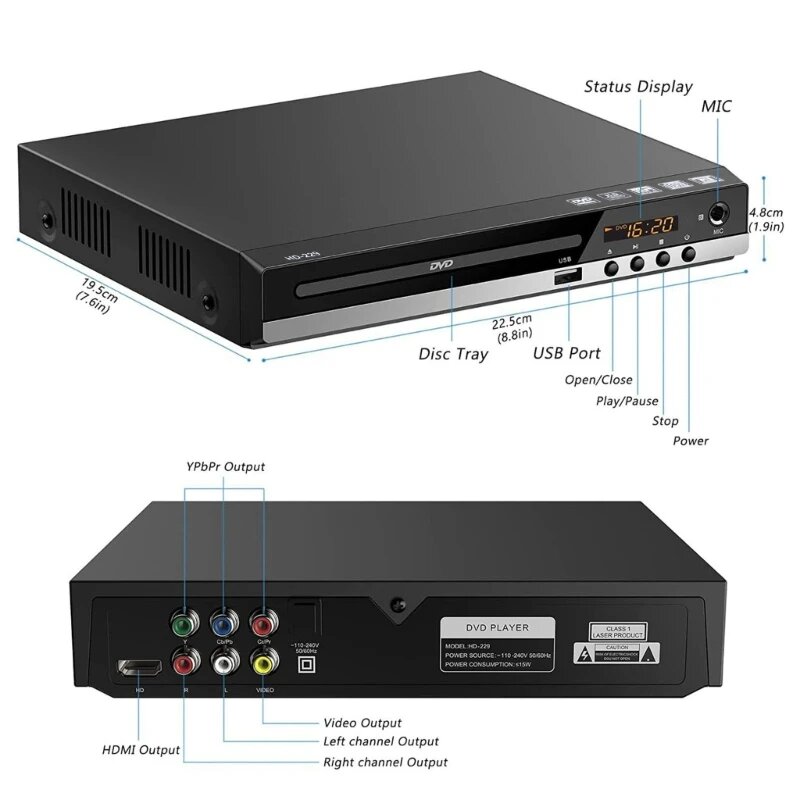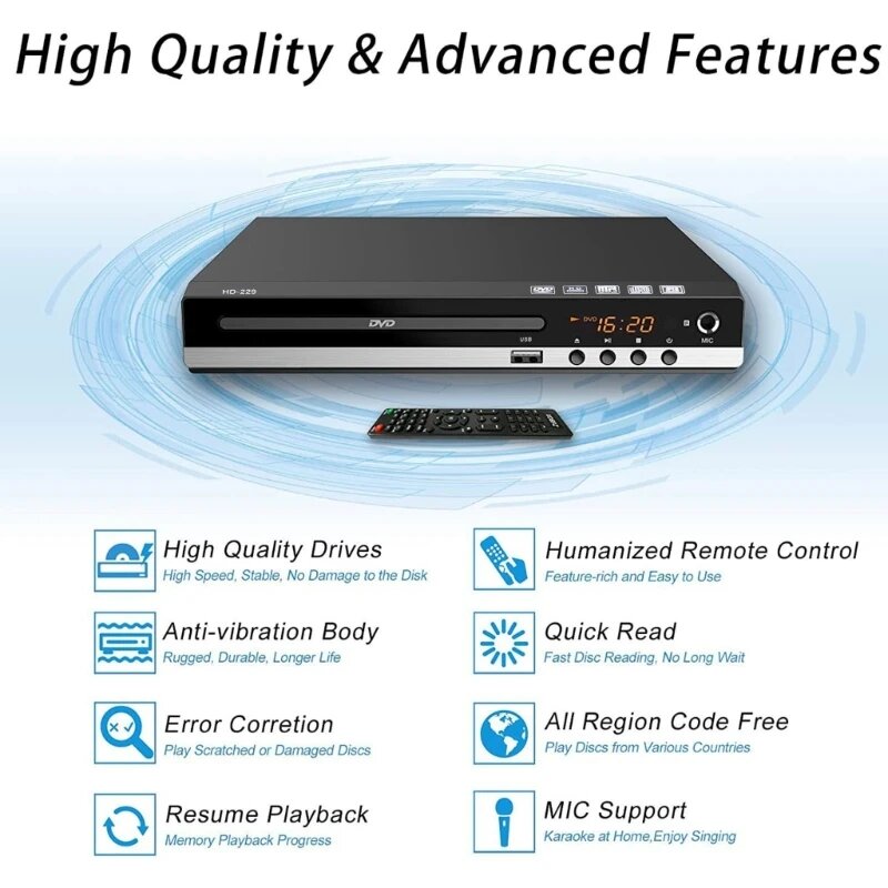 Домашний DVD-плеер высокой четкости 1080P для телевизора, проигрыватель DVD и компакт-дисков во всех регионах, AV-выход, порт интересное: