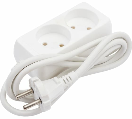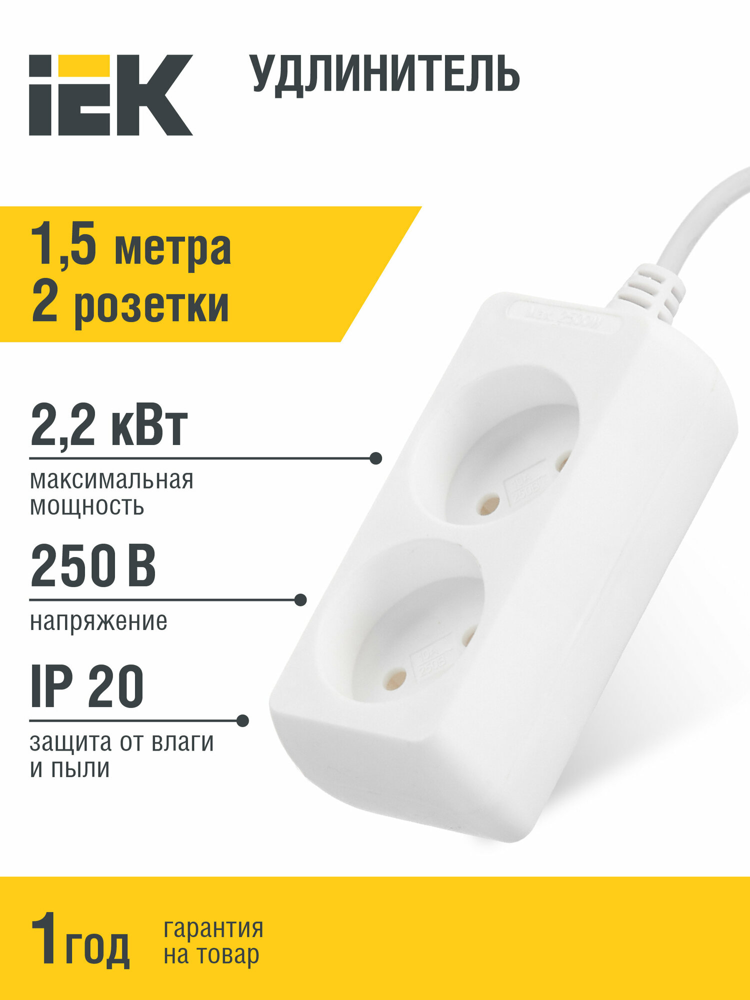 Удлинитель IEK У2, 2 x 0,75 мм², 2 розетки, без заземления, 1,5 м, белый