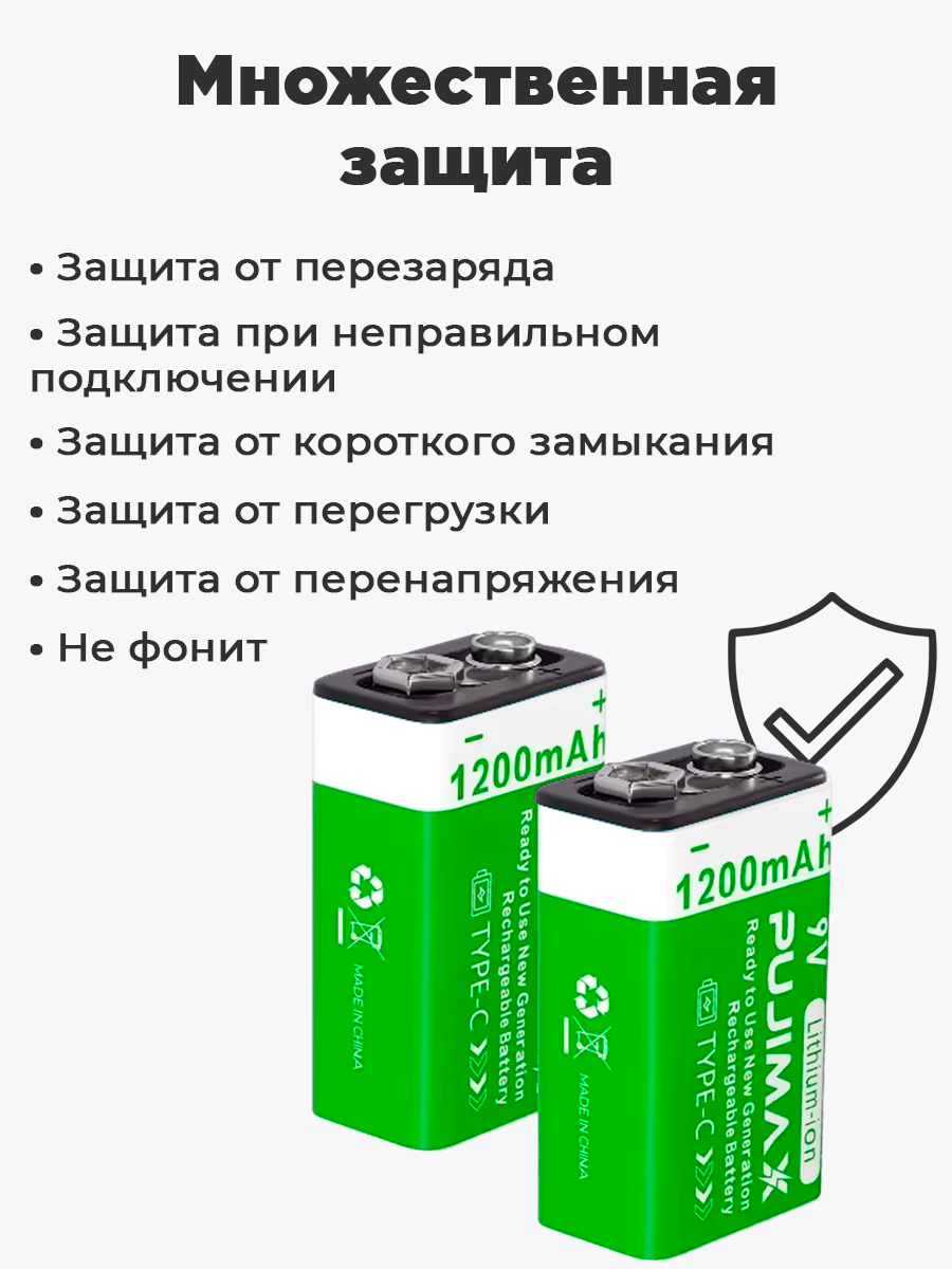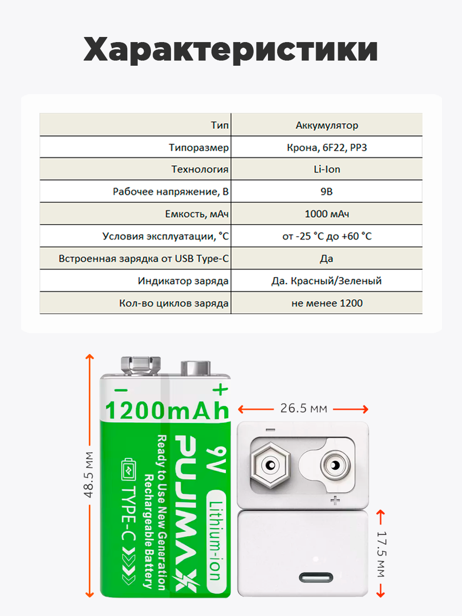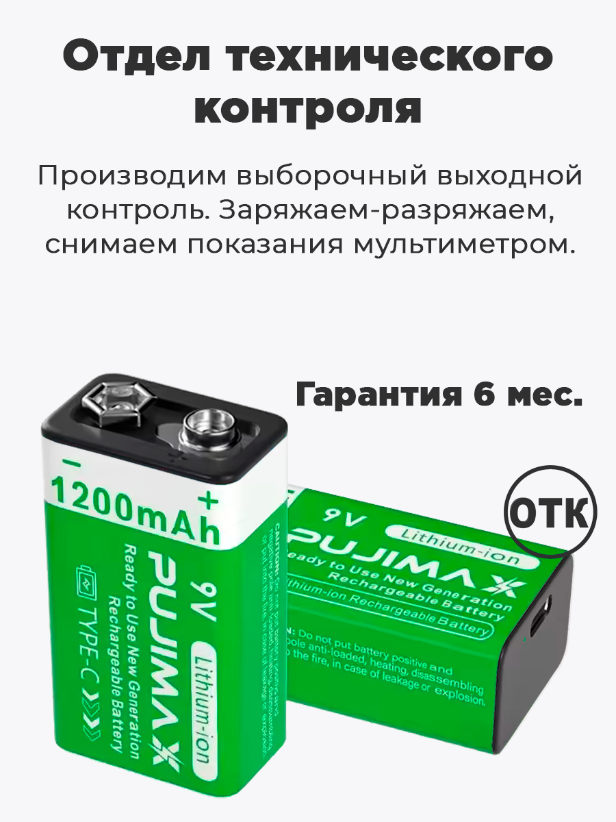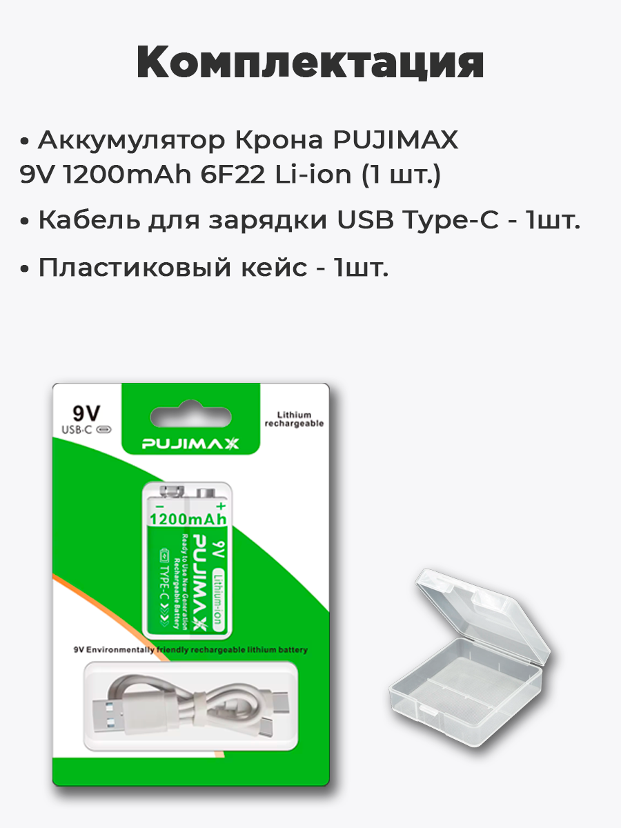 Аккумулятор Крона PUJIMAX 9V 1200mAh 6F22 Li-ion + кабель USB Type-C (Комплект 1шт.) интересное: