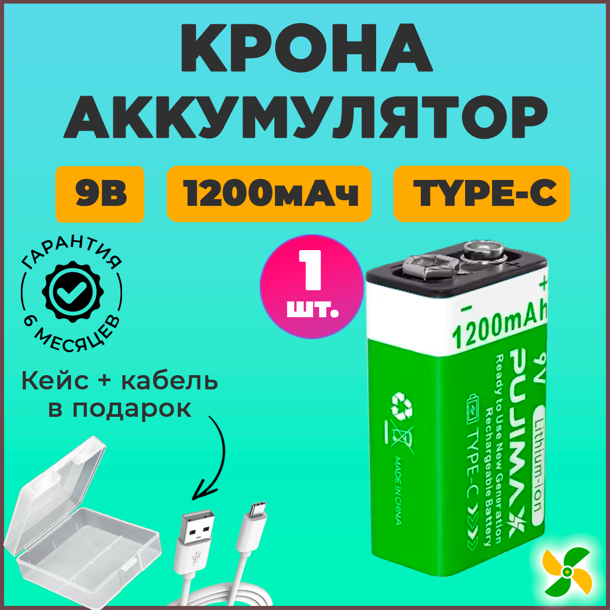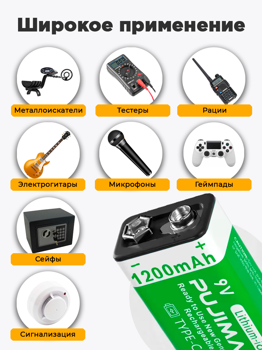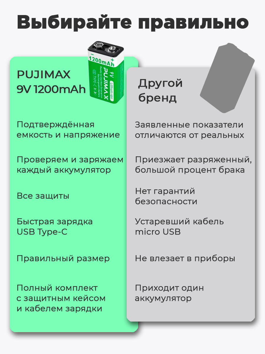 Аккумулятор Крона PUJIMAX 9V 1200mAh 6F22 Li-ion + кабель USB Type-C (Комплект 1шт.) интересное:
