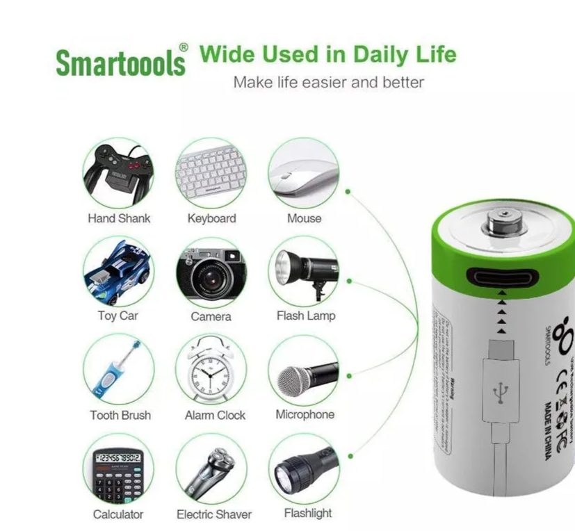 Smartoools Аккумуляторные перезаряжаемые батарейки Li-ion АА 1,5V 2600 mWh (4шт) с USB кабелем пальчиковые