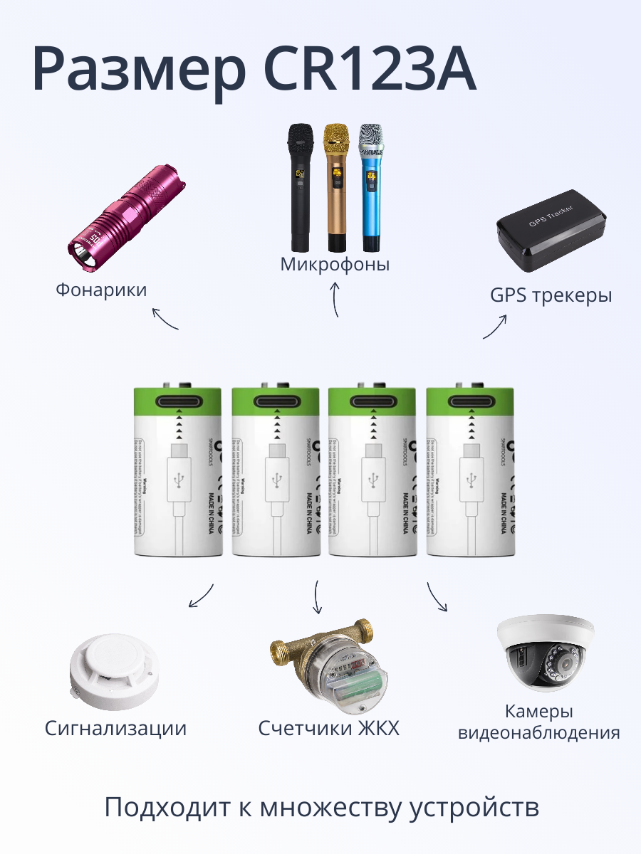 | Типоразмер | 10440 / 14250 / 14500 / 18650 (168A) / AA (R6 / LR6 / FR6 / HR6 / ZR6) / AAA (R03 / LR03 / FR03 / HR03 / ZR03 / MN2400) / C / CR123 / D / Крона (6LR61 / 6LF22 / 6KR61 / 1604A) / СR2 (15270 / CR17355 / 5046LC) |