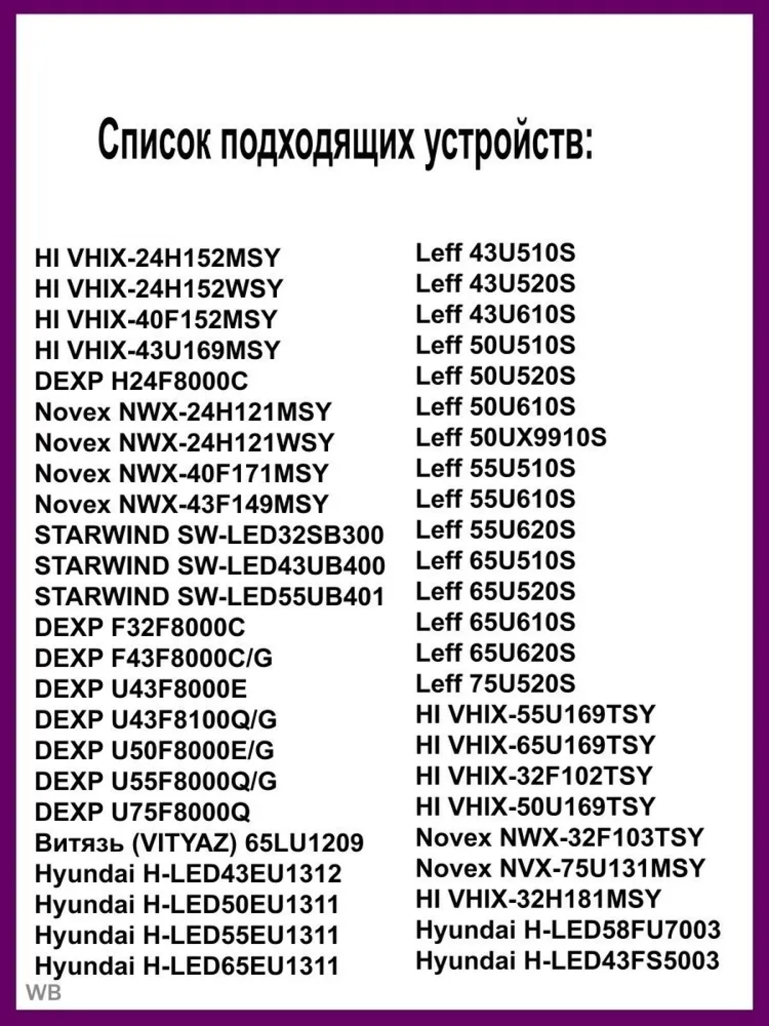 | Производитель совместимых устройств | DEXP / Hi / Hyundai / Leff / Novex / Polar / STARWIND / Telefunken / Витязь |