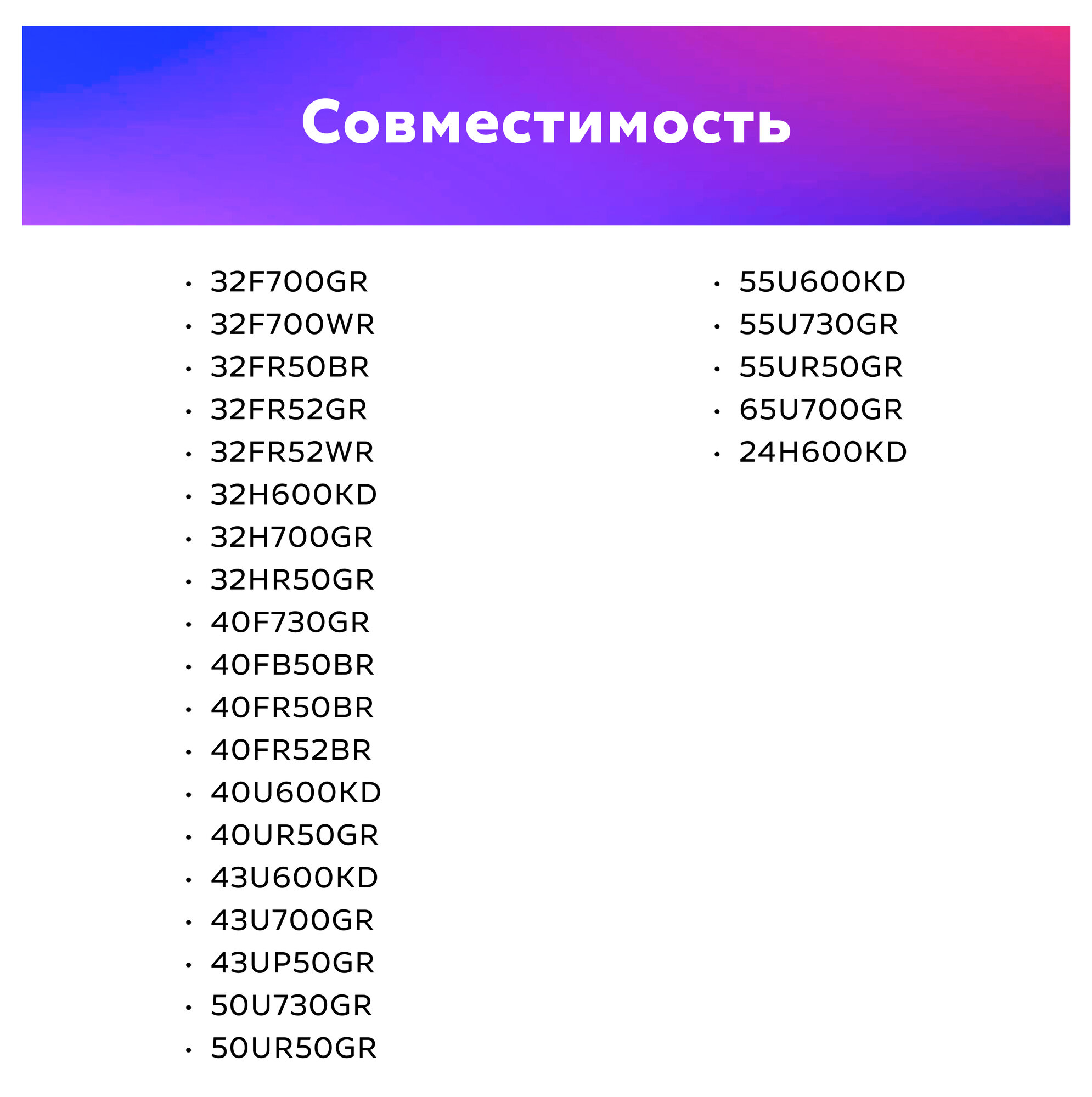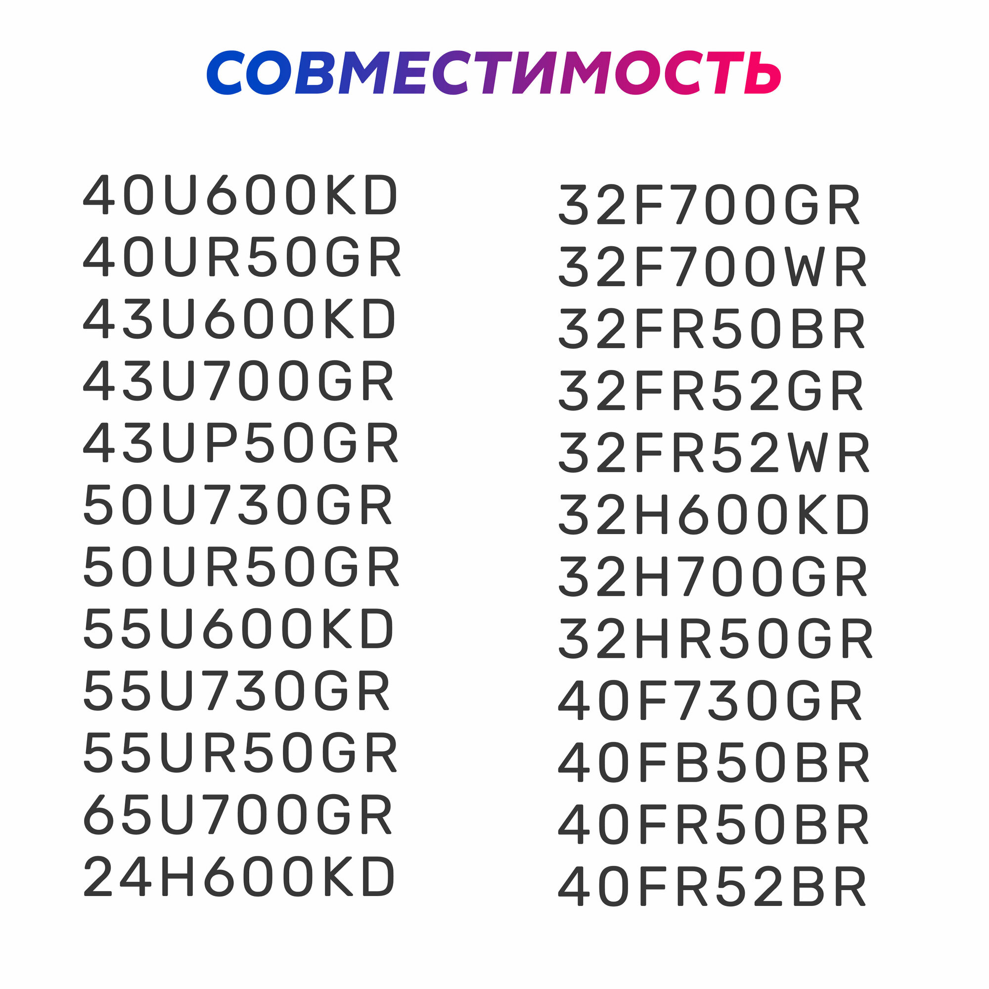 | Назначение | 32F700GR, 32F700WR, 32FR50BR, 32FR52GR, 32FR52WR, 32H600KD, 32H700GR, 32HR50GR, 40F730GR, 40FB50BR, 40FR50BR, 40FR52BR, 40U600KD, 40UR50GR, 43U600KD, 43U700GR, 43UP50GR, 50U730GR, 50UR50GR, 55U600KD, 55U730GR, 55UR50GR, 65U700GR |