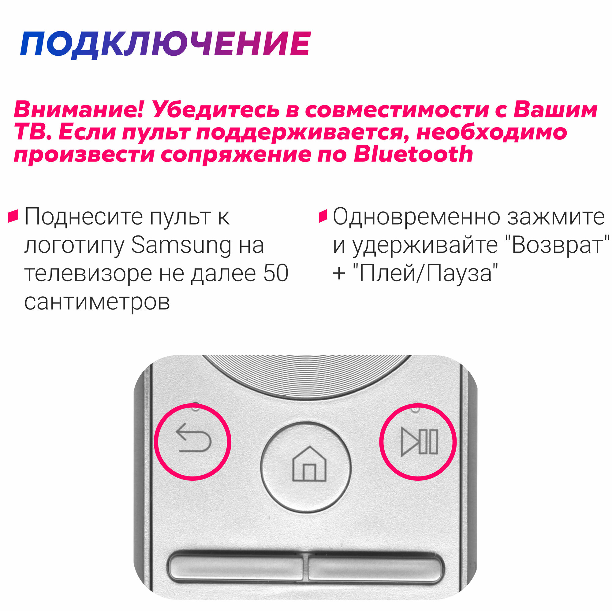 | Назначение | Пульт работает по Bluetooth и для его работы нужно произвести настройку. Заменяет пульты: BN59-01242A, BN59-01242C, BN59-01265A, BN59-01266A, BN59-01270A, BN59-01274A, BN59-01278A, BN59-01290A, BN59-01298G, BN59-01300F, BN59-01300G, BN59-01300J, BN59-01309B, BN59-01311B, BN59-01311G, BN59-01311H, BN59-01312B, BN59-01312H, BN59-01312R, BN59-01335B, BN59-01336B, BN59-01350J, BN59-01357B, BN59-01357C, BN59-01357H, BN59-01363G. |