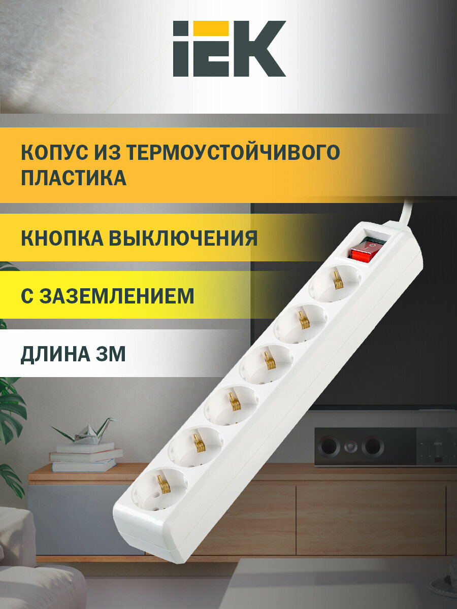 Купить Удлинитель с выключателем IEK У06К-выкл, ПВС 3 x 1 мм², с заземлением, 6 розеток, 3 м, белый