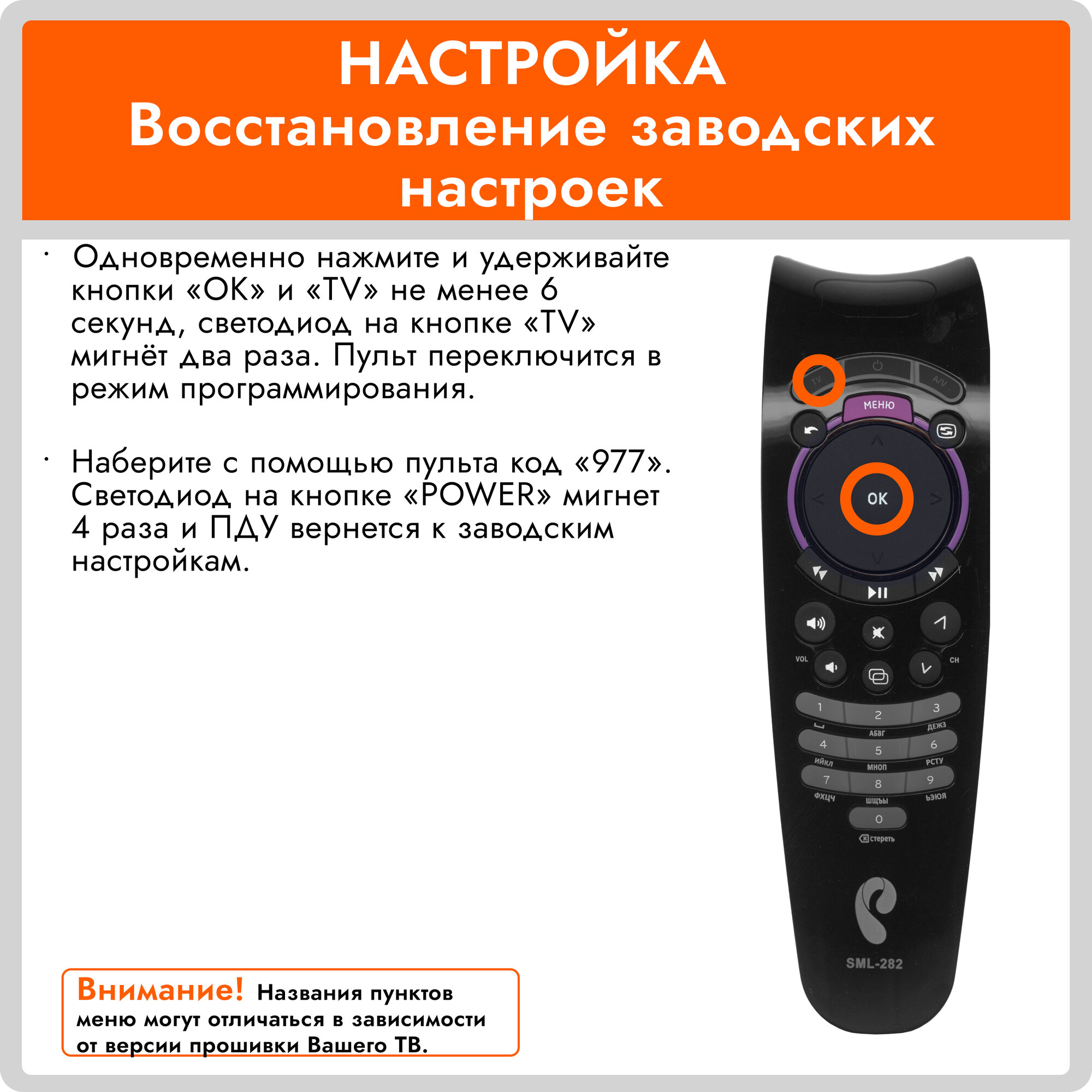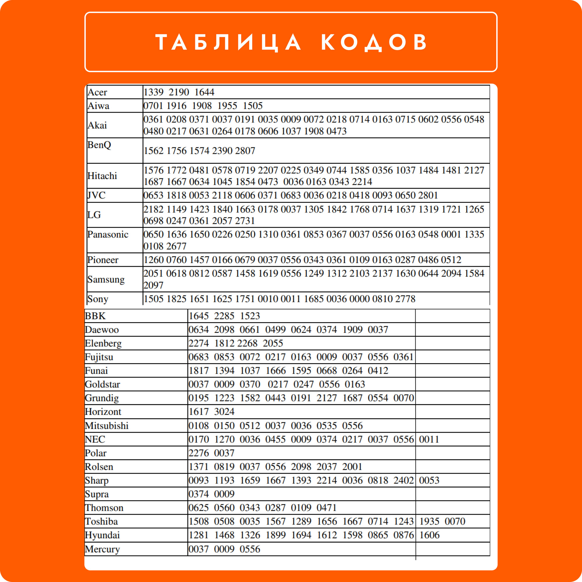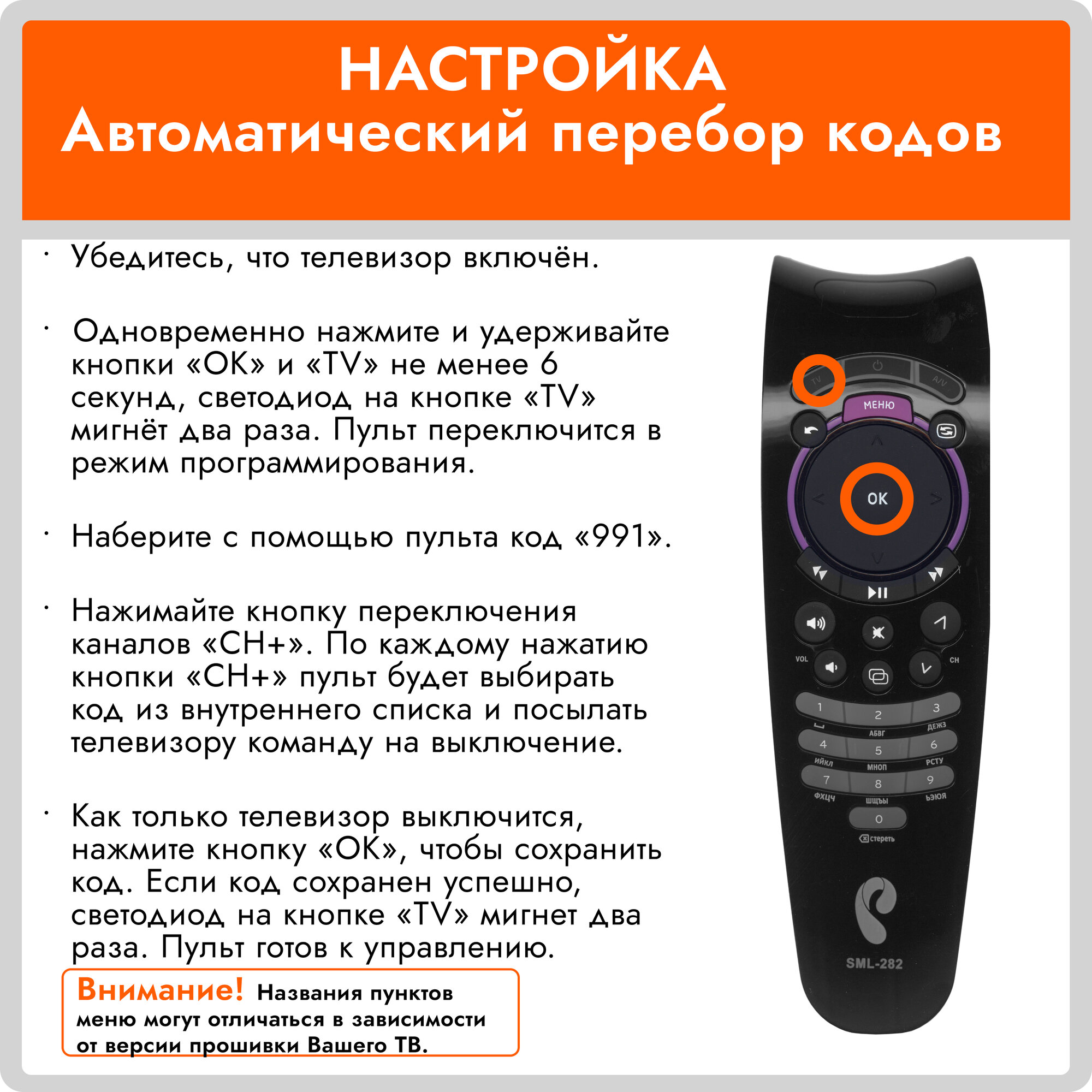 | Настройка пульта ДУ | автоподбор кода / ввод кода / обучение |