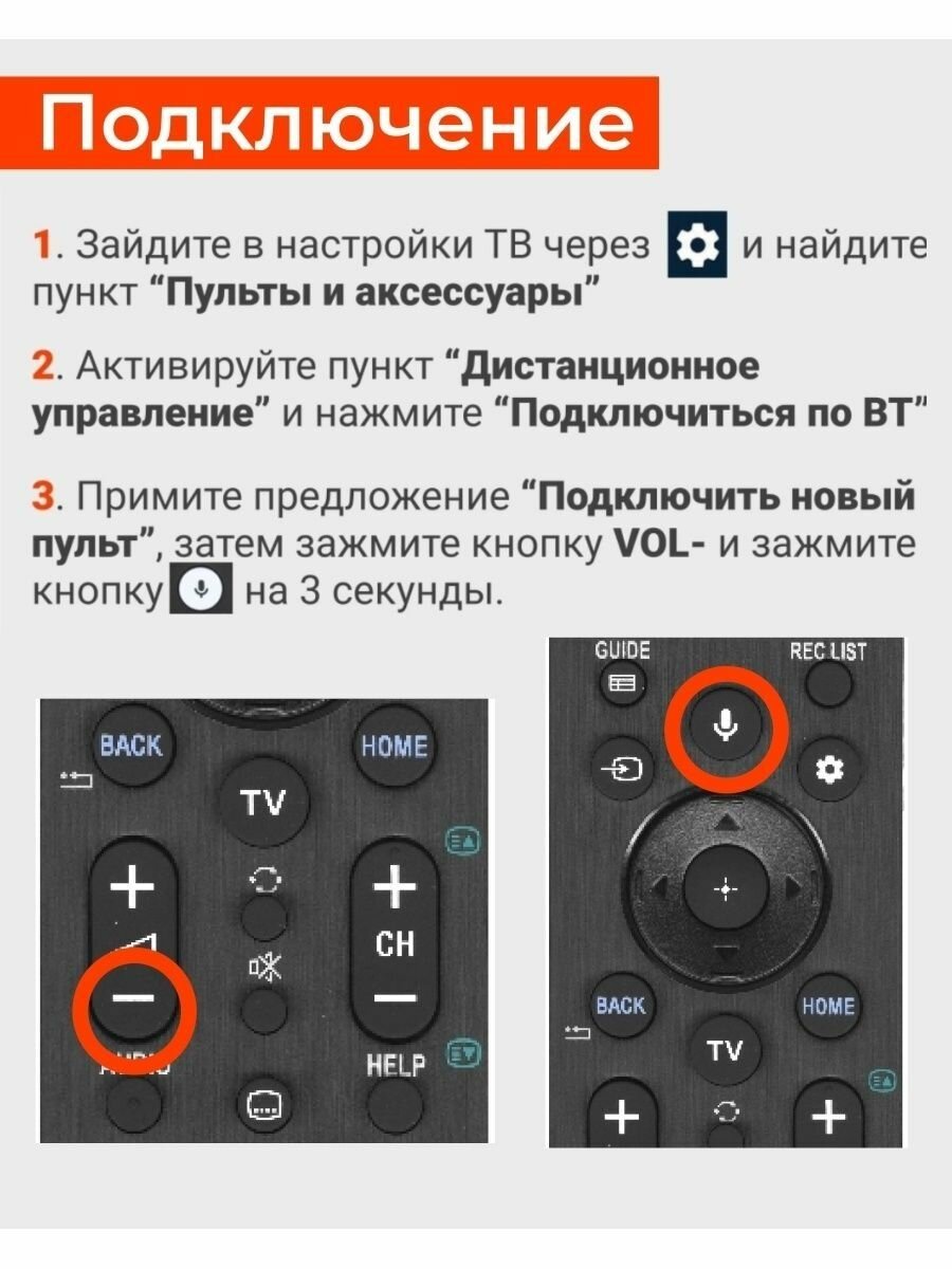| Дополнительная информация | Для работы пульта необходимо выполнить его подключение (сопряжение) с телевизором. Нажмите кнопку HOME, выберите меню Установки Выберите Голосовое дистанционное управление и нажмите кнопку активации Нажмите и удерживайте VOL- на пульте Продолжая удерживать VOL- нажмите и удерживайте кнопку микрофона на 3 секунды В некоторых версиях Android обозначения могут отличаться. Обратитесь к инструкции вашего ТВ за подробным описанием. |