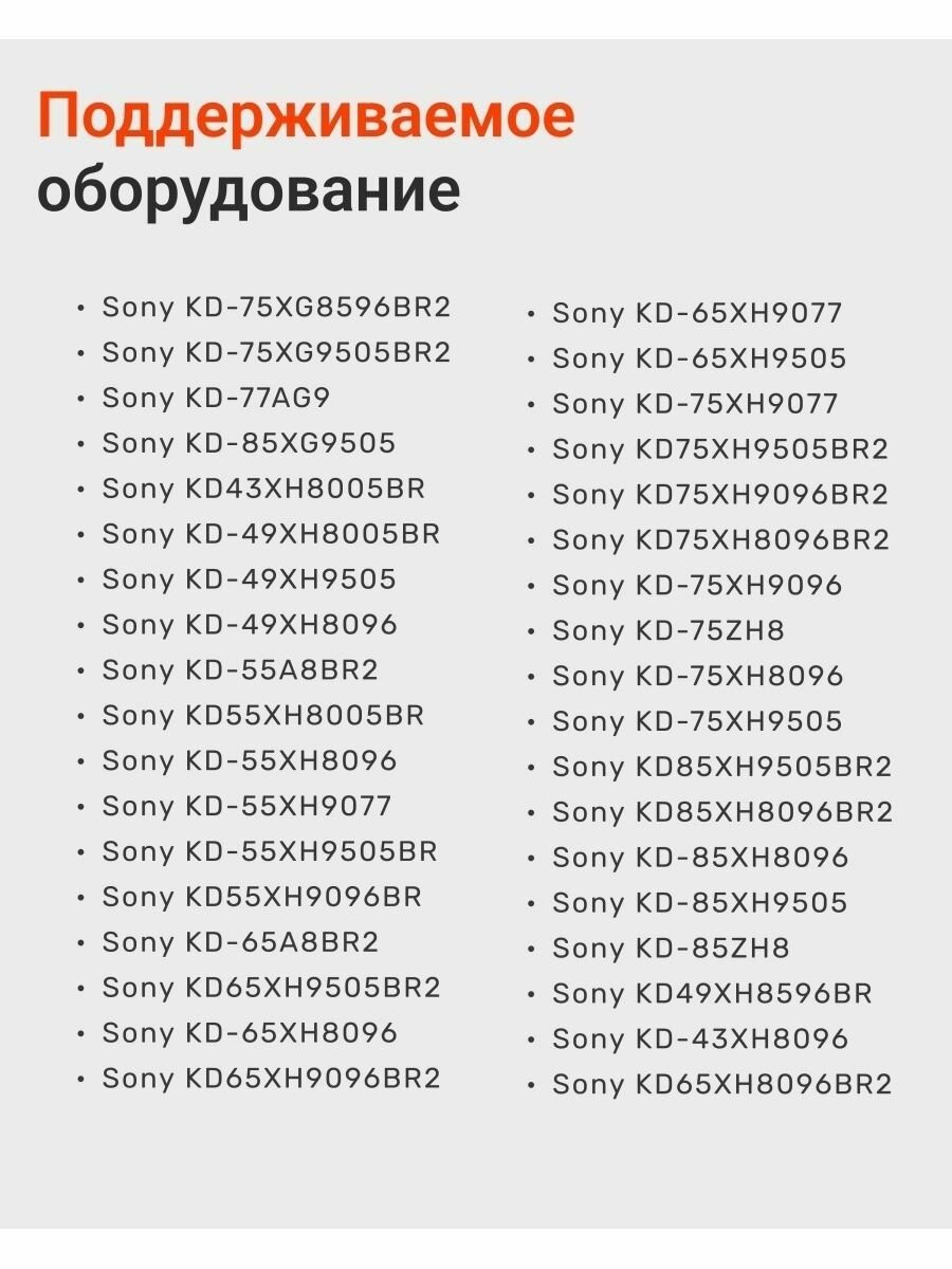 | Назначение | KD-85XG9505, KD-85XH8096, KD-85XH9505, KD-85ZH8, KD49XH8596BR, KD43XH8005BR, KD-43XH8096, KD-49XH8005BR, KD-49XH9505, KD-49XH8096, KD-55A8BR2, KD-55XG9505, KD-55XG8596, KD55XH8005BR, KD-55XH8096, KD-55XH9077, KD-55XH9505BR, KD55XH9096BR, KD-65A8BR2, KD65XH9505BR2, KD65XH8096BR2, KD-65XH8096, KD-65XG8596, KD-65XG9505, KD65XH9096BR2, KD-65XH9077, KD-65XH9505, KD-75XH9077, KD75XH9505BR2, KD75XH9096BR2, KD75XH8096BR2, KD-75XH9096, KD-75ZH8, KD-75XH8096, KD-75XG8596BR2, KD-75XG9505BR2, KD-75XH9505, KD-77AG9, KD85XH9505BR2, KD85XH8096BR2 |