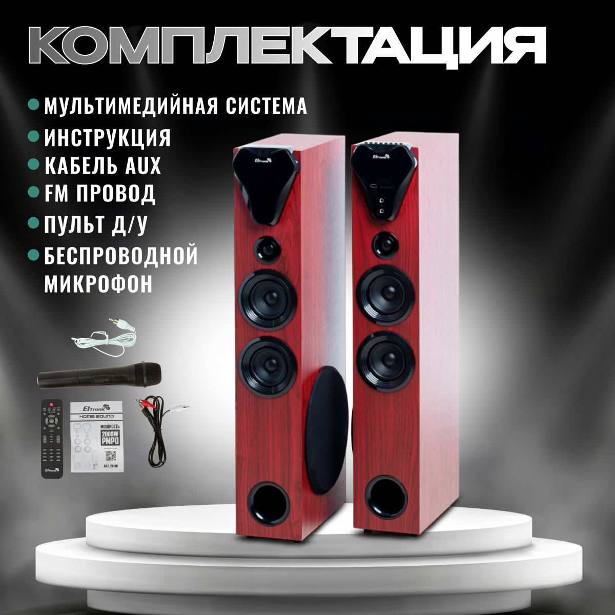 | Комплектация | Акустическая система (2шт) - Микрофон беспроводной 1 шт. - Пульт Д/У - Инструкция |
