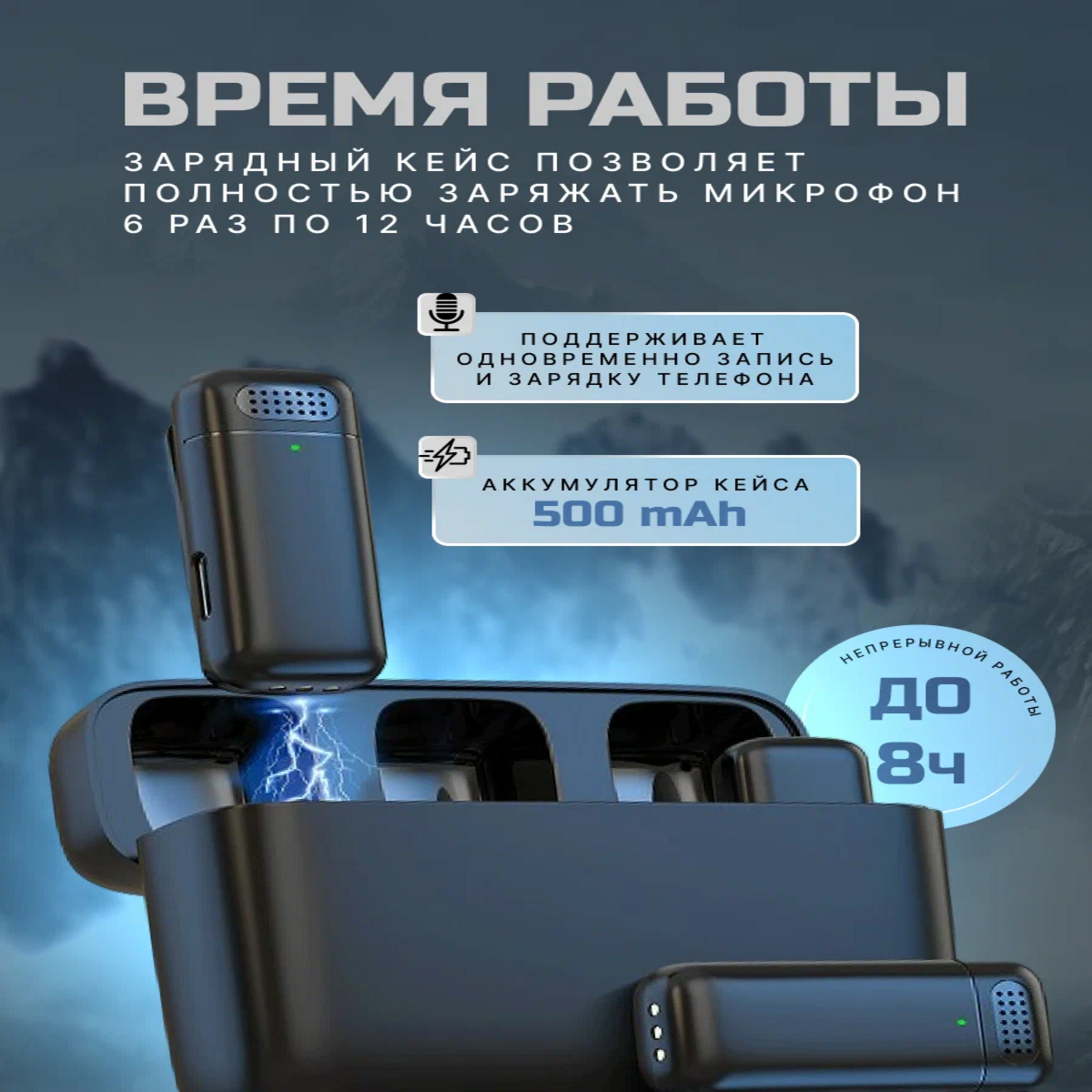 | Подробная комплектация | Зарядный кейс - 1шт; петличный микрофон - 2шт; приемник Lightning - 1шт; зарядное устройство type-c - 1шт; руководство пользователя |