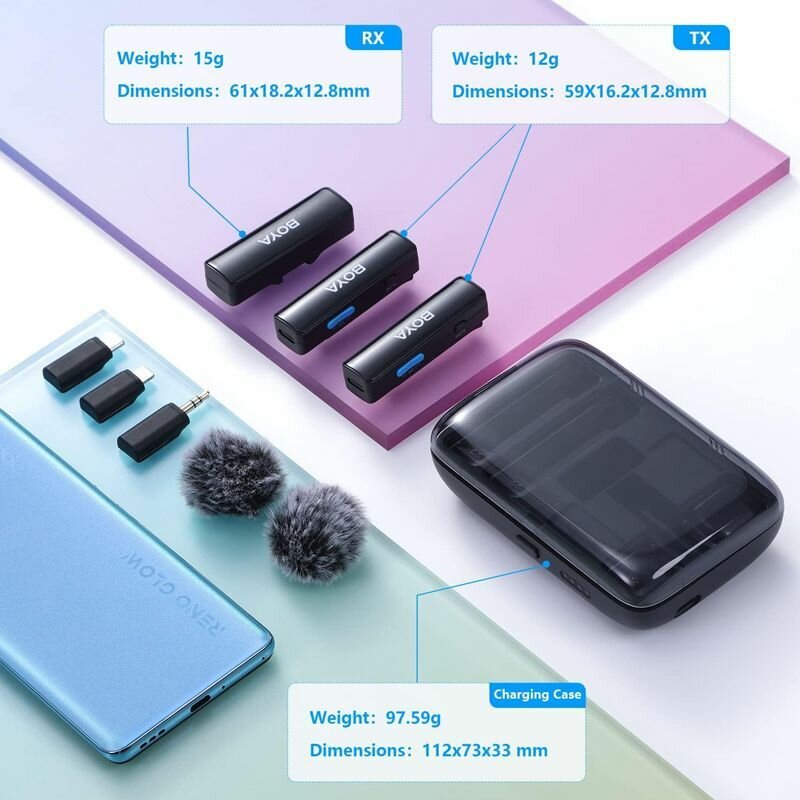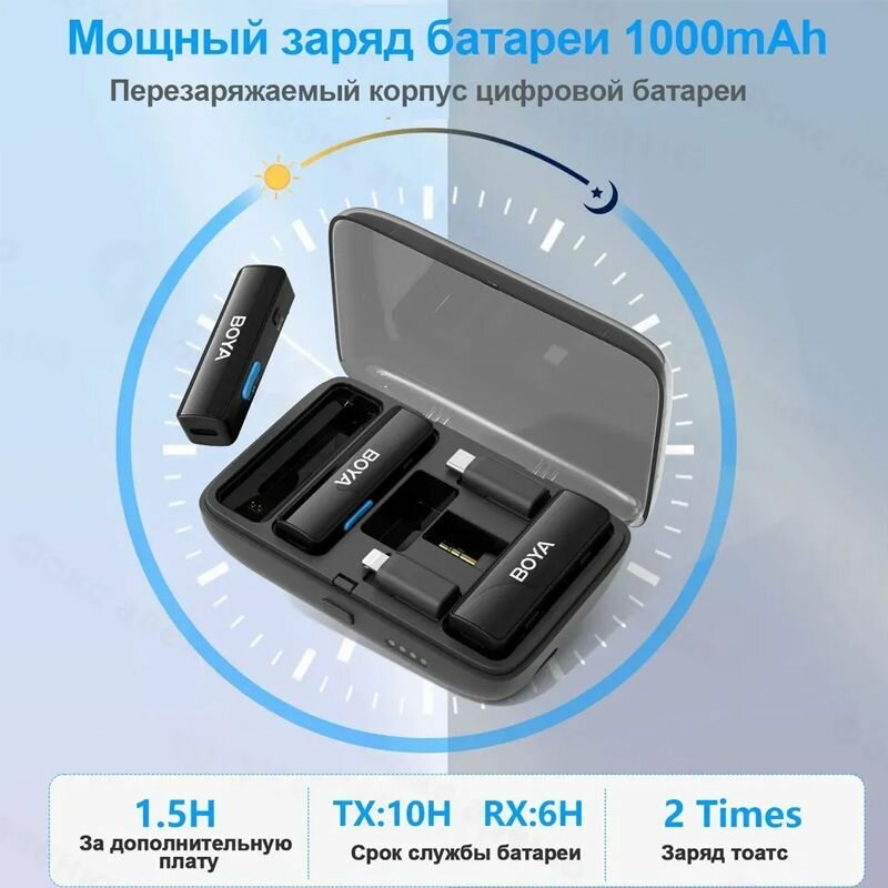 | Подробная комплектация | ПУ * 2 Прием * 1 Зарядная коробка * 1 3.5 мм переключатель TRS * 1 Переключатель Type - C * 1 Конвертер MFi Lightning * 1 ветрозащитный чехол * 2 Линия передачи данных USB - A в Type - C Сумка * 1 |
