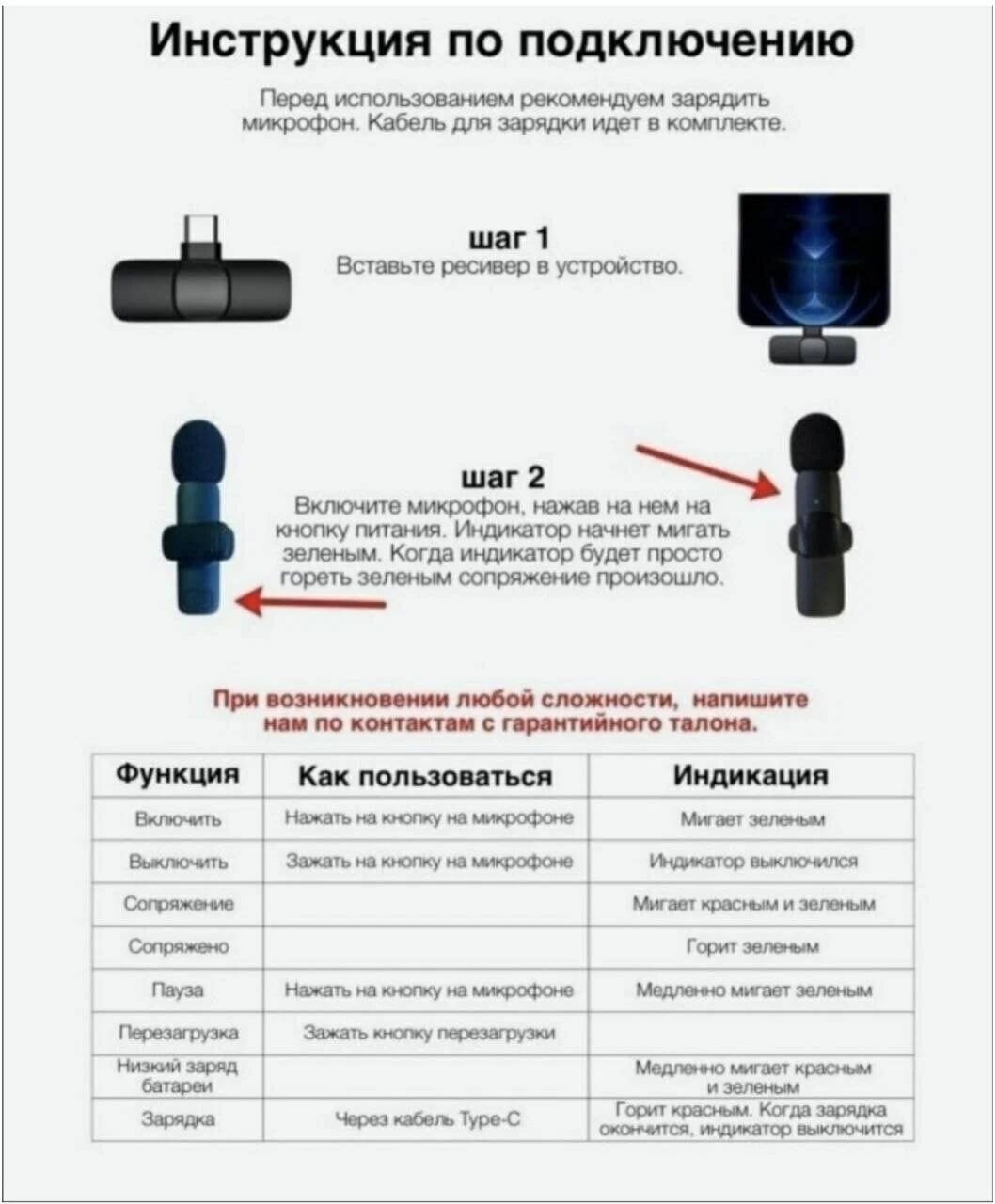| Подробная комплектация | 2 микрофона, передатчик, кабель для зарядки |