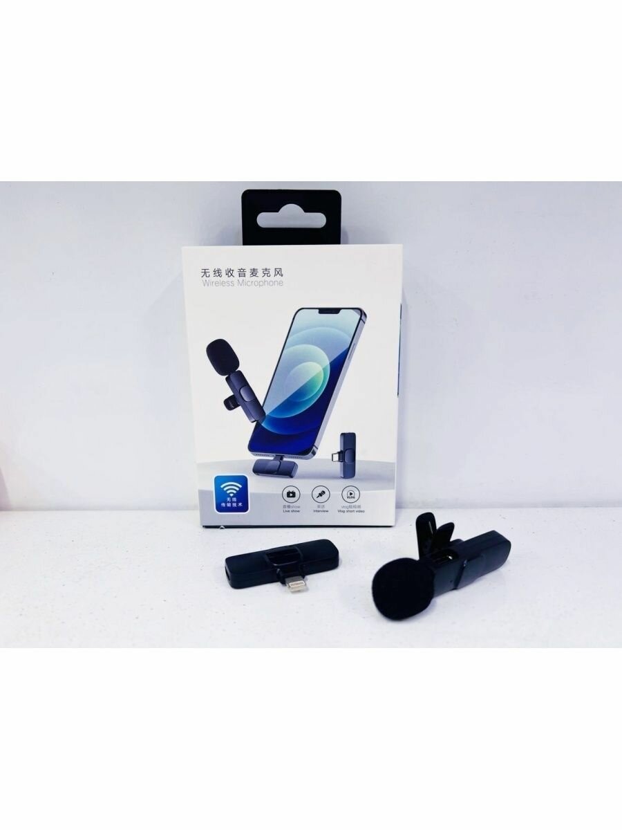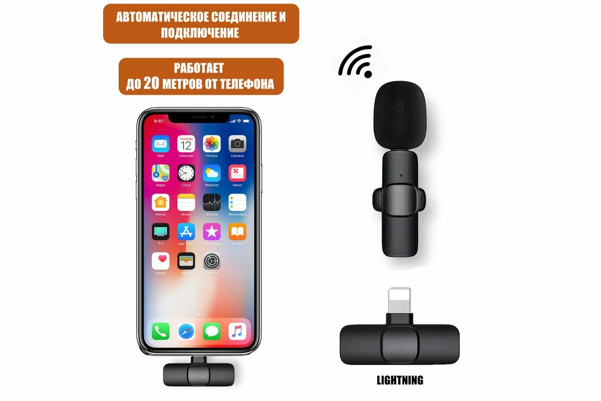 Микрофон петличный беспроводной, с шумоподавлением, петличка, для мобильного телефона, разъем Lightning, для Iphone, черный, 2шт