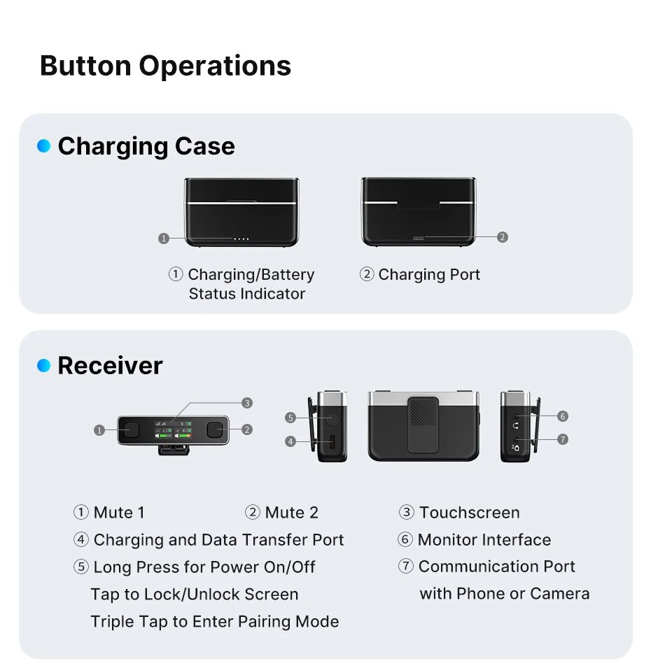 | Подробная комплектация | Микрофон-передатчик с зажимом - 1 шт. Приемник с разъемом Type-C - 1 шт Зарядный кабель - 1 шт Зарядный кейс-чехол - 1 шт |