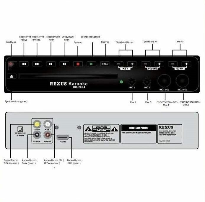 | Подробная комплектация | Караоке-плеер REXUS RK-2024-1шт; Пульт ДУ-1шт; Кабель 3RCA-3RCA-1шт; Инструкция на русс.языке-1шт; Диск Дуэты-1шт. |