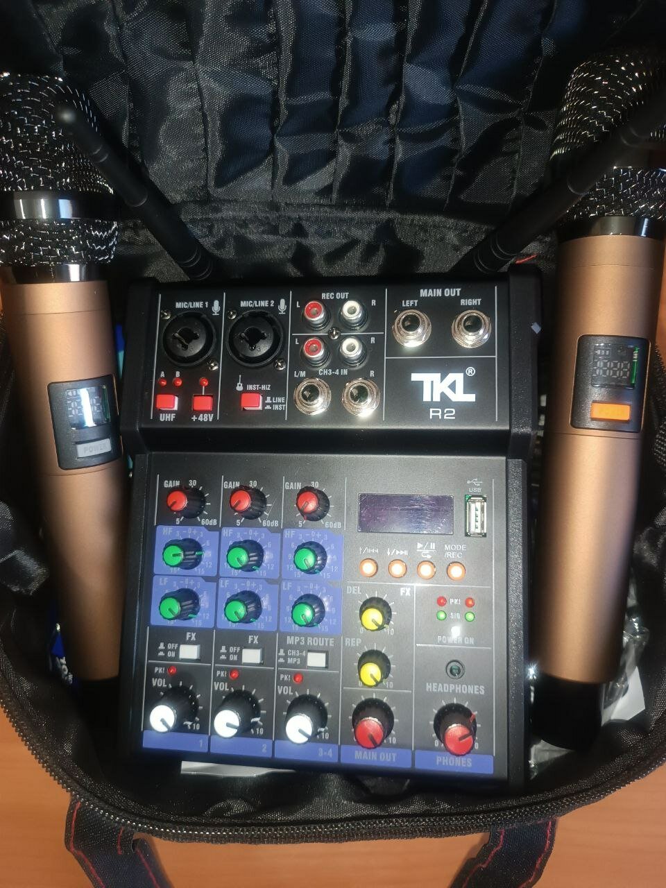 Купить Полный комплект для караоке под ключ. В кейсе-сумке. TKL - микшер с эффектами и Bluetooth, беспроводные микрофоны, коммутация. 15в1. Подарочный пак.
