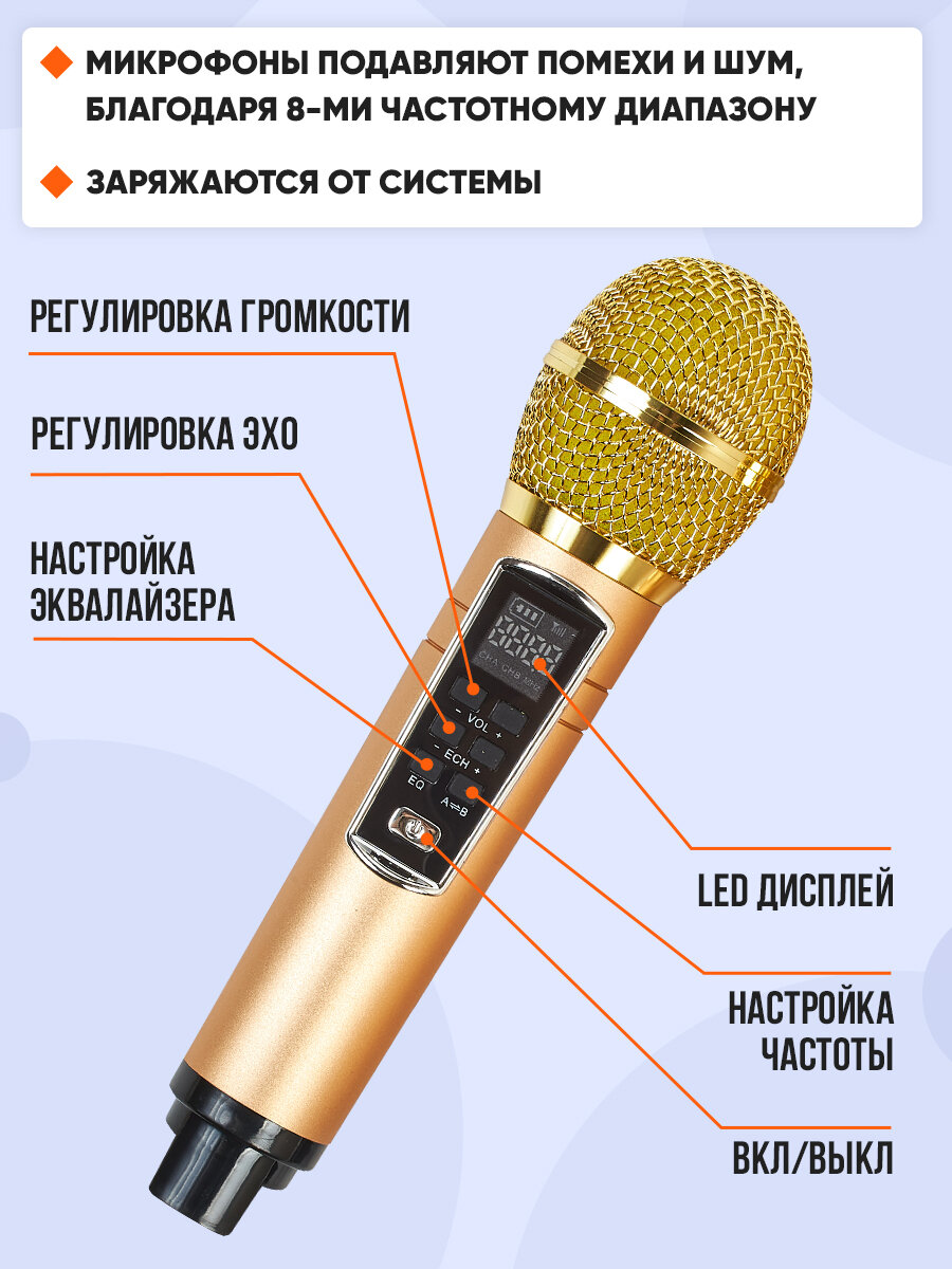 СохранитьКараоке система с двумя беспроводными микрофонами "SD-306 PLUS" золотая интересное: