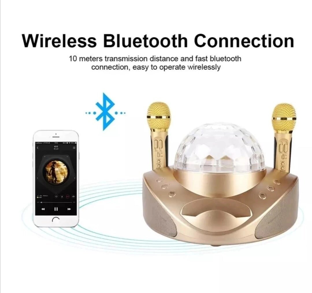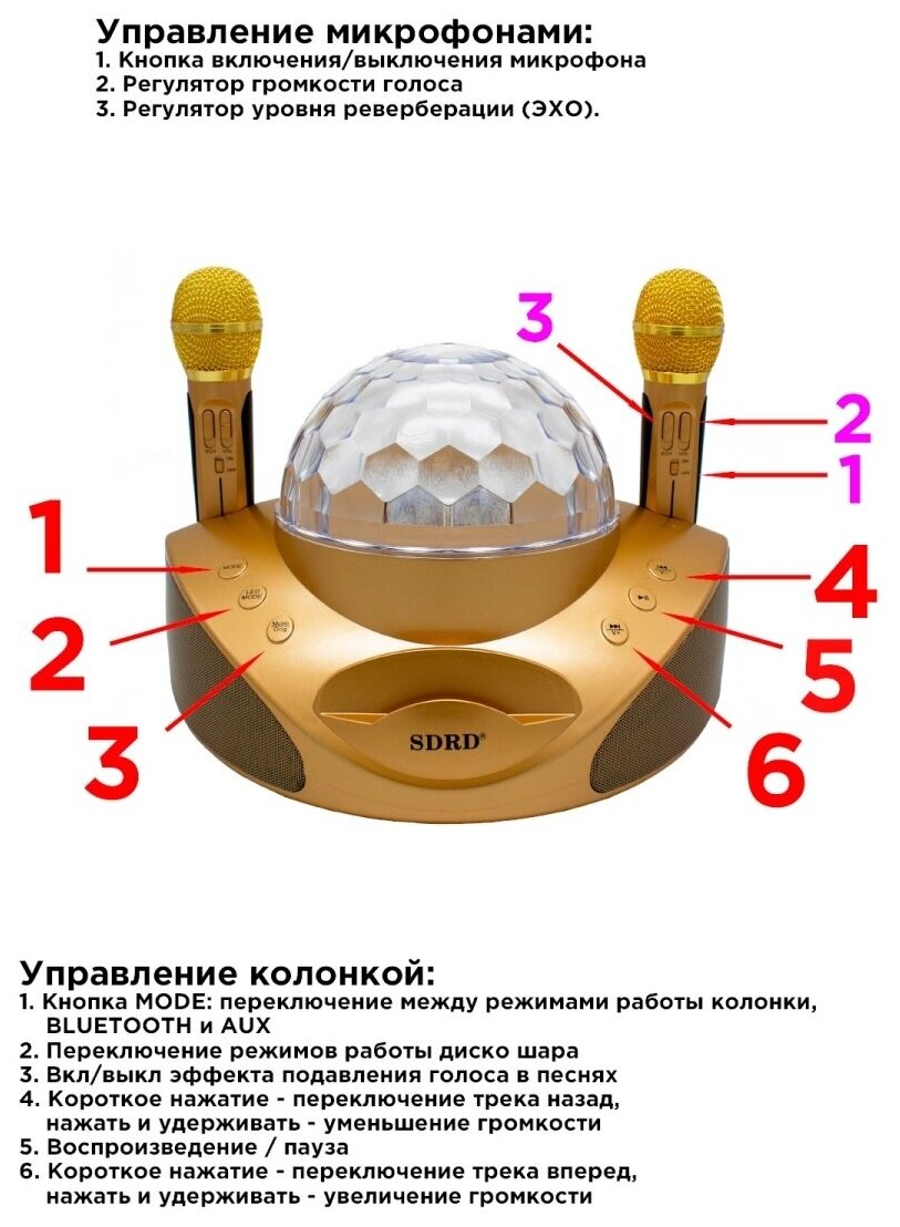 Караоке система беспроводная с Диско Шаром и двумя микрофонами SD-308 золото интересное: