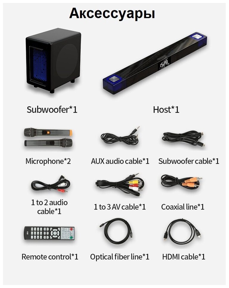 | Подробная комплектация | фронтальная колонка/саундбар, сабвуфер, пульт ДУ, кабеля для подсоединения |