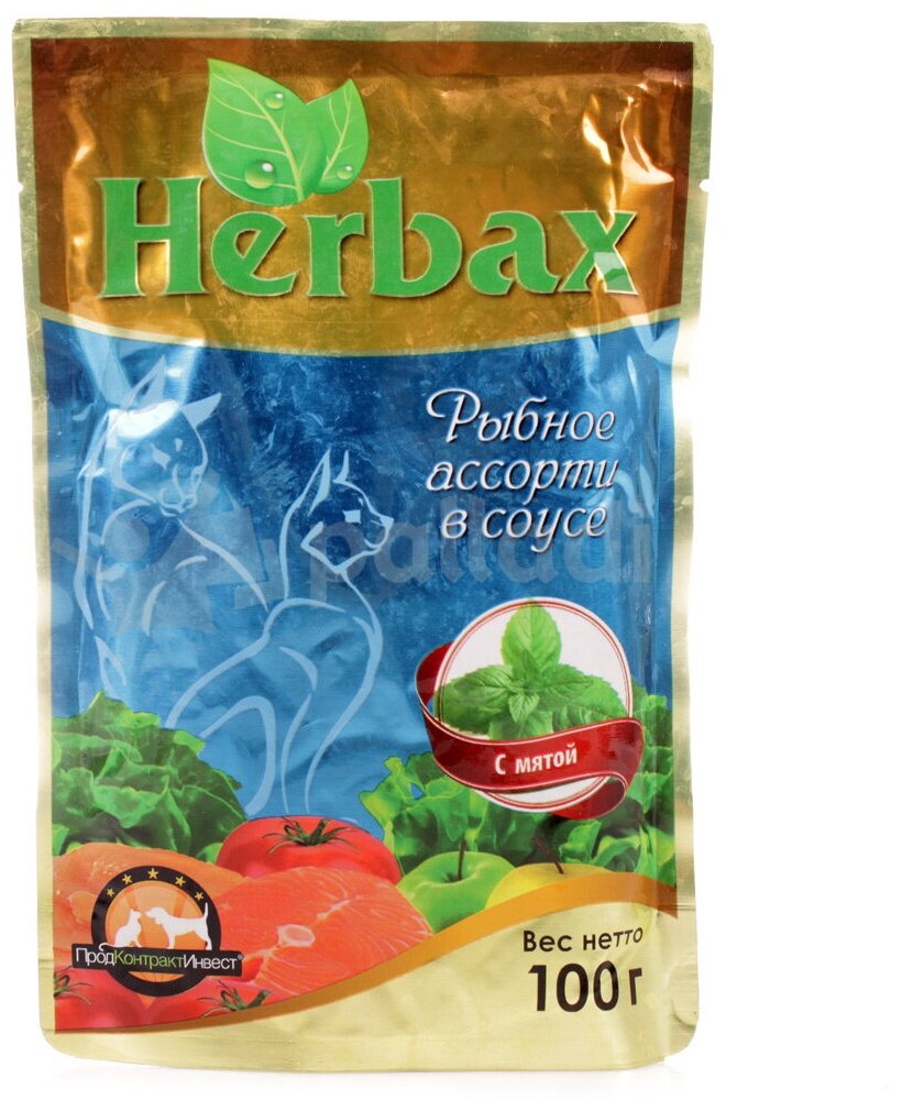 Купить Herbax Паучи для кошек рыбное ассорти в соусе с мятой 100г 24шт