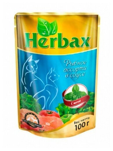 Herbax Паучи для кошек рыбное ассорти в соусе с мятой 100г 24шт