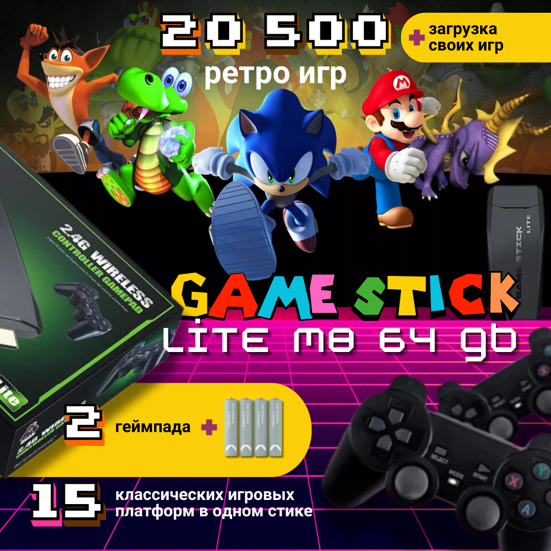 Игровая приставка Game Stick Lite M8 64 ГБ, 20 000+ ретро игр 90х и 2000-х, 9 эмуляторов Денди, Сега и др, 2 беспроводных геймпада с батарейками, подарок геймеру