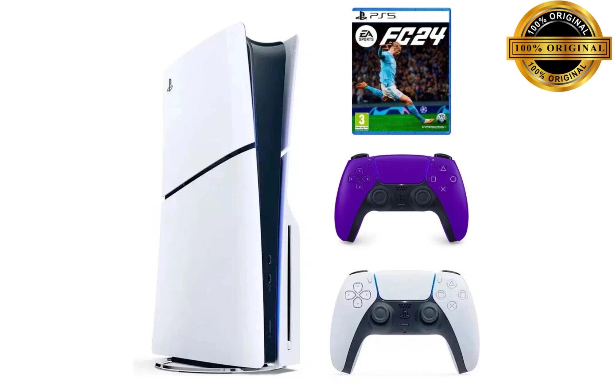 Игровая приставка Sony PlayStation 5 Slim, с дисководом, 1 ТБ, два геймпада (белый и фиолетовый), Fifa 24