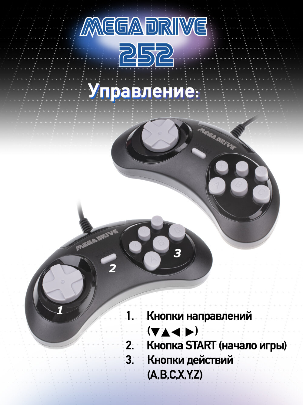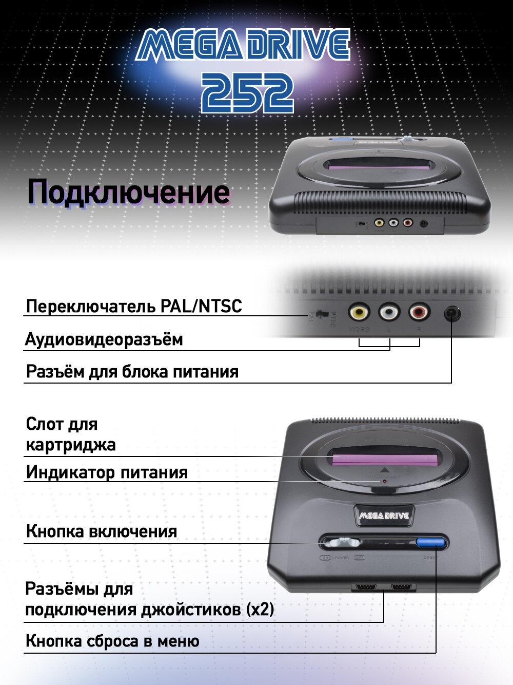 | Дополнительная информация | Комплектация: 1. Игровая консоль – 1 шт. 2. Джойстики – 2 шт. 3. Блок питания 9В - 1 шт. 4. Кабель AV Sega RCA - 1 шт. 5. Инструкция по эксплуатации – 1 шт. |