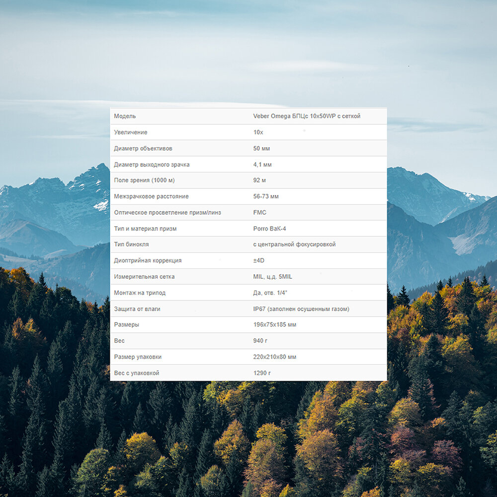 | Дополнительная информация | Комплектация: Бинокль Veber Omega БПЦс 12x50WP; Крышки объективов; Шейный ремешок; Материал для очистки линз; Сумка для хранения; Упаковочная коробка; Руководство по эксплуатации и гарантийный талон |