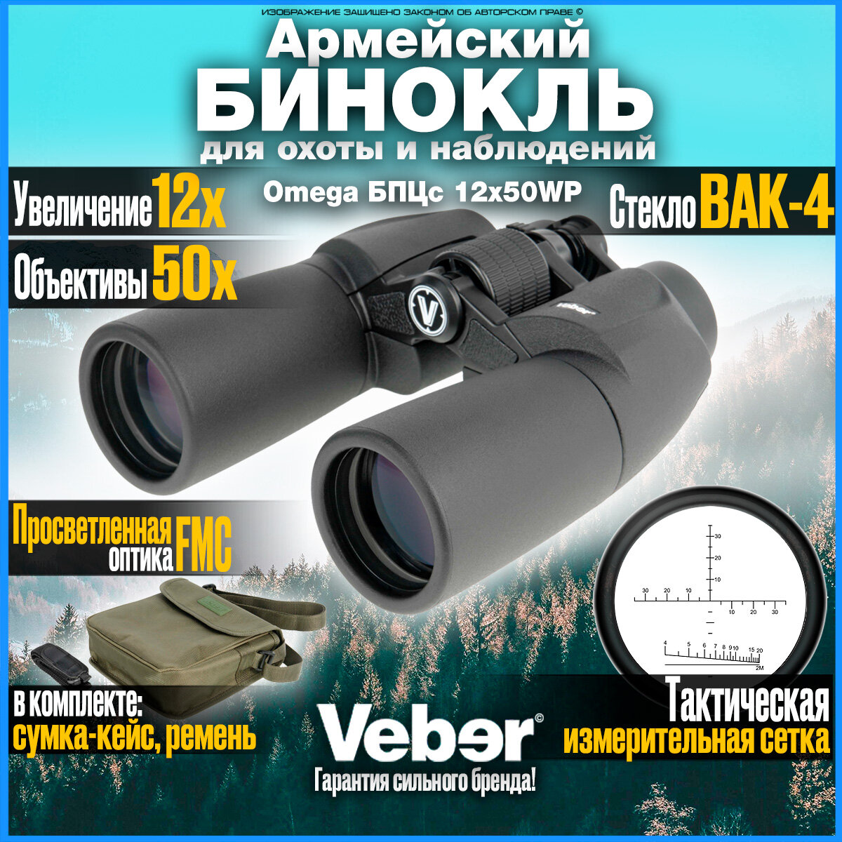 Купить Мощный влагозащищенный армейский бинокль с угломерной сеткой и дальномерной шкалой для охоты и наблюдений Veber Omega БПЦс 12x50WP