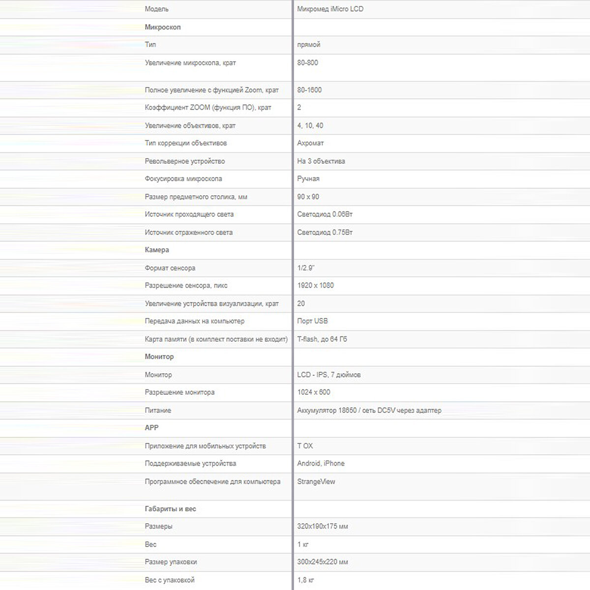 | Вес микроскопа | 2.2 кг |