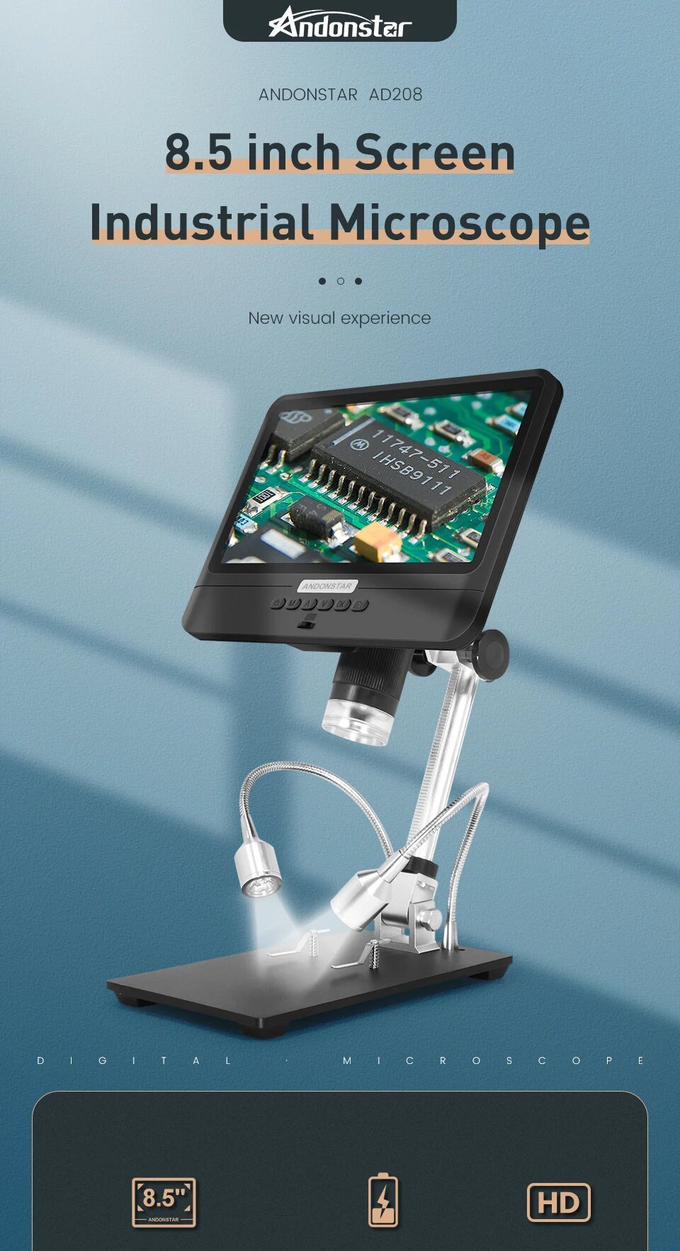Цифровой микроскоп Andonstar AD208S, регулируемый микроскоп с ЖК-экраном 8,5 дюйма и USB, 1080P, прибор для пайки SMT/PCB интересное: