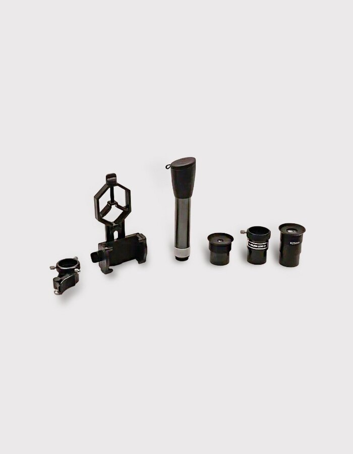 | Комплектация | Оптическая труба телескопа Азимутальная монтировка Алюминиевая тренога с лотком для аксессуаров Оптический искатель 5х20 Окуляр K9 мм, 1,25" Окуляр K25 мм, 1,25" Диагональная призма Линза Барлоу 3х Адаптер для смартфона Сумка для переноски Книга знаний «Космос. Непустая пустота» Инструкция по эксплуатации и гарантийный талон |