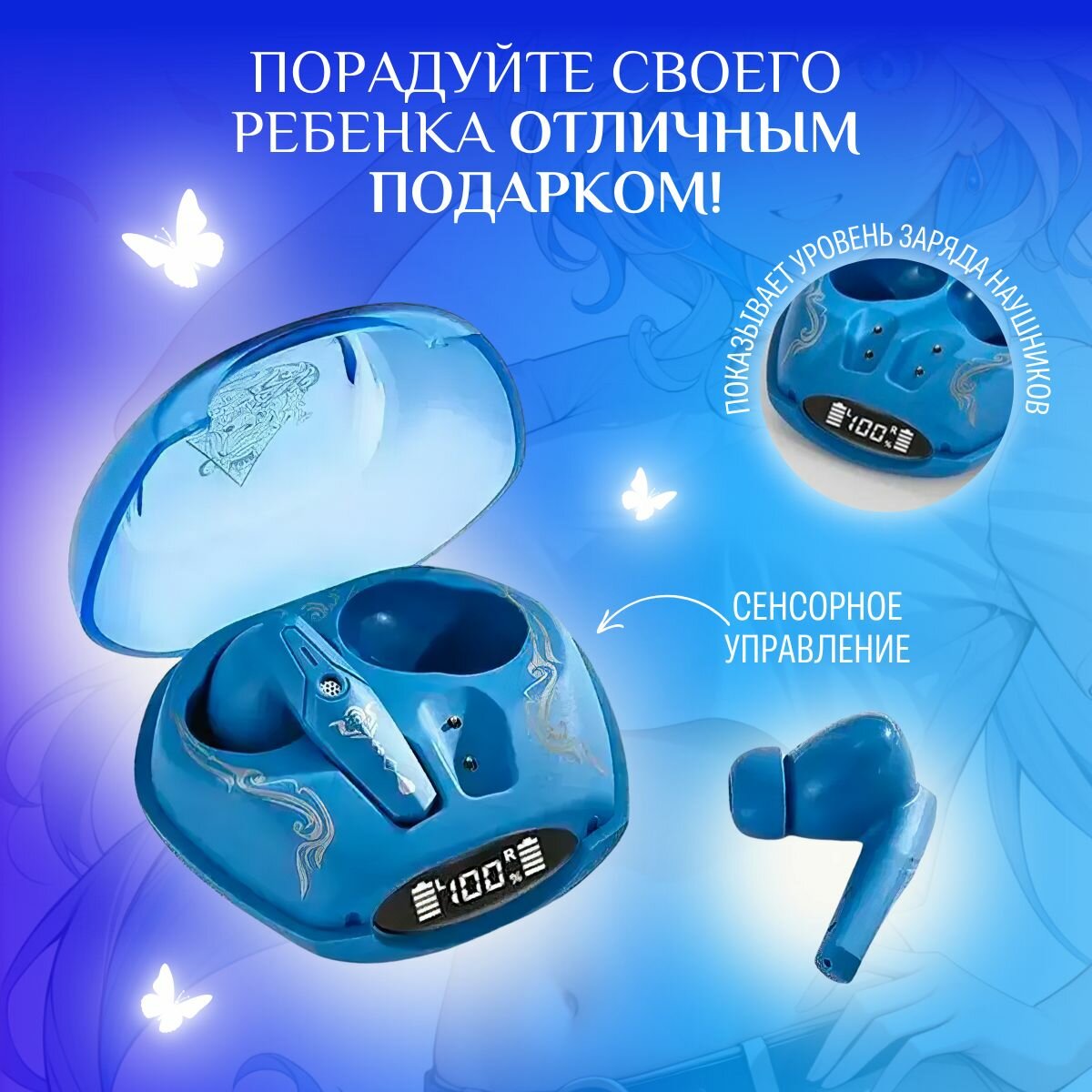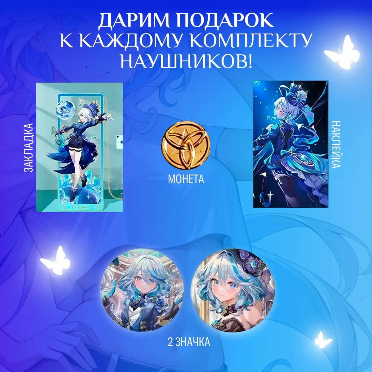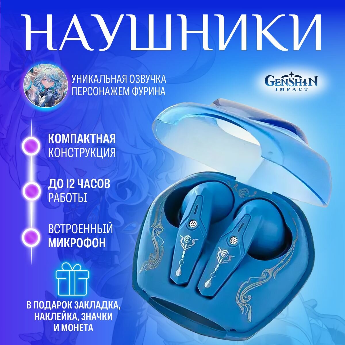 СохранитьНаушники беспроводные со встроенным микрофоном Bluetooth Genshin Impact Геншин Импакт Фурина с сенсорным управлением, блютуз гарнитура для телефона и компьютера, подарок детям интересное: