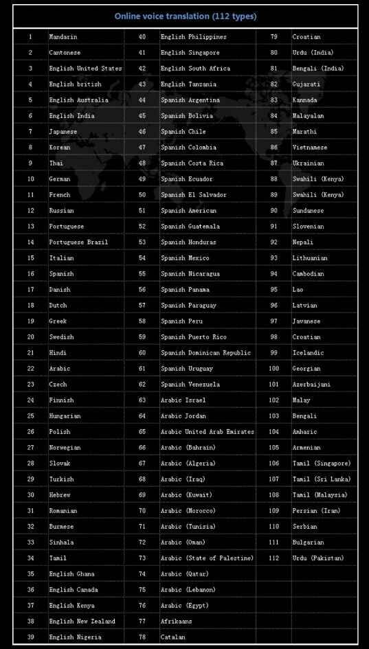 | Язык перевода | английский / испанский / итальянский / кантонский / китайский (традиционный) / китайский (упрощенный) / корейский / немецкий / португальский / французский / японский |