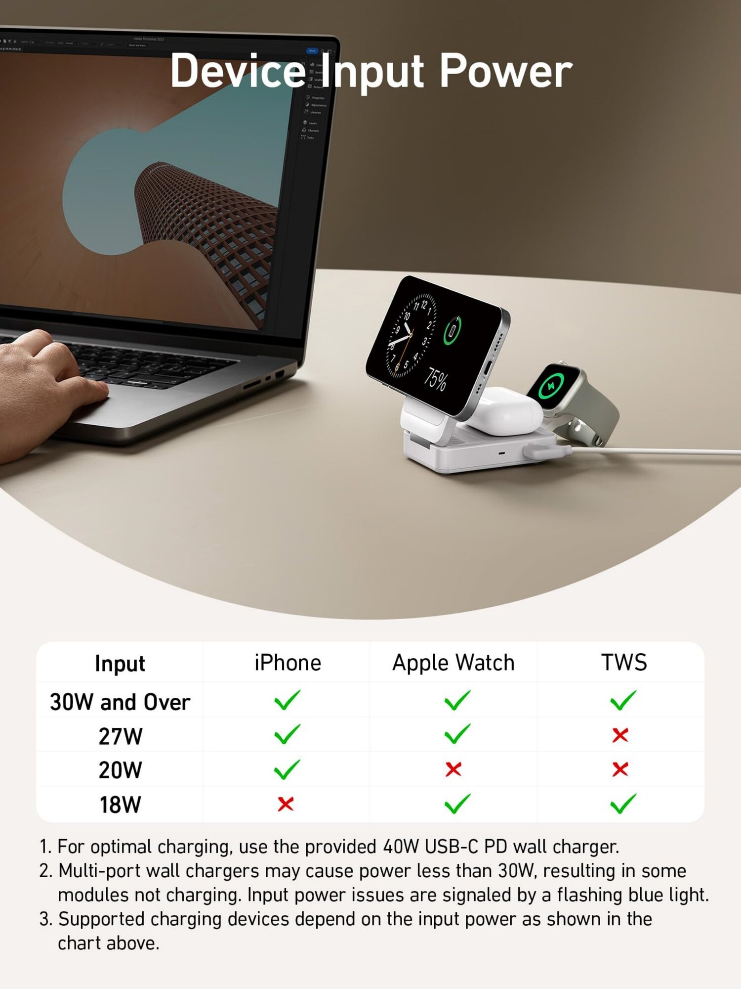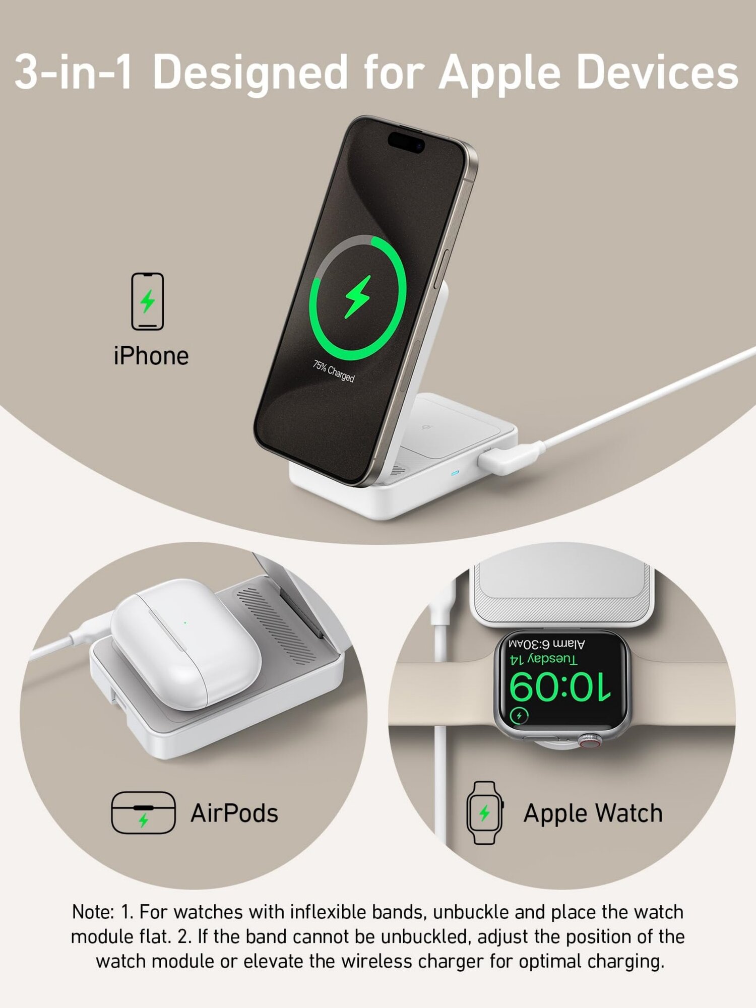 | Конструкция беспроводного устройства | для 1 телефона / зона для Apple Watch / зона для беспроводных наушников |