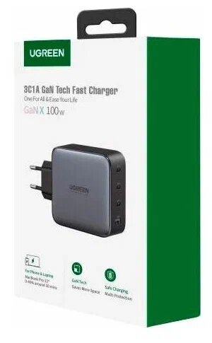 Сетевое зарядное устройство Ugreen USB-A + 3хUSB-C, 100 Вт, GaN Tech Fast Charger, черный