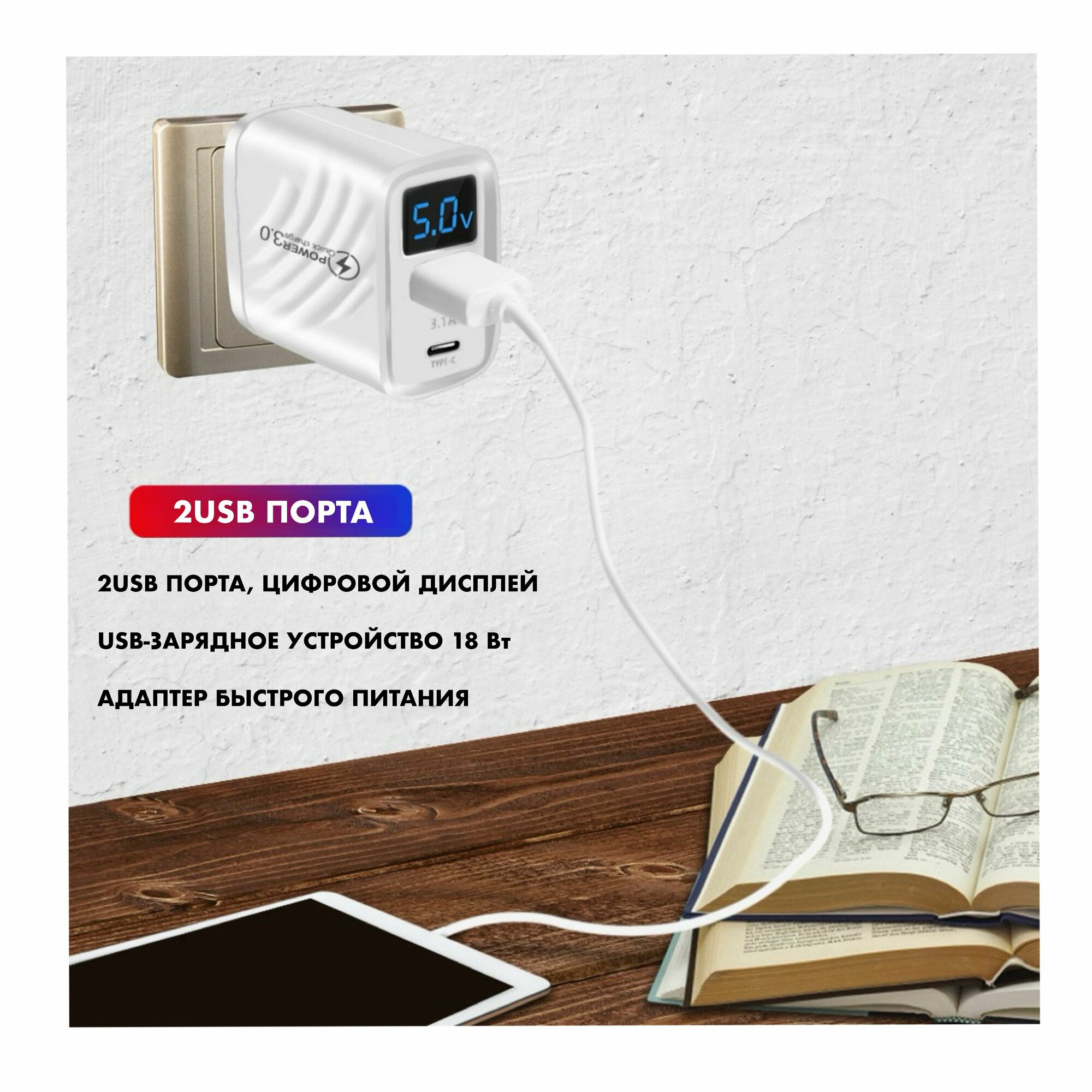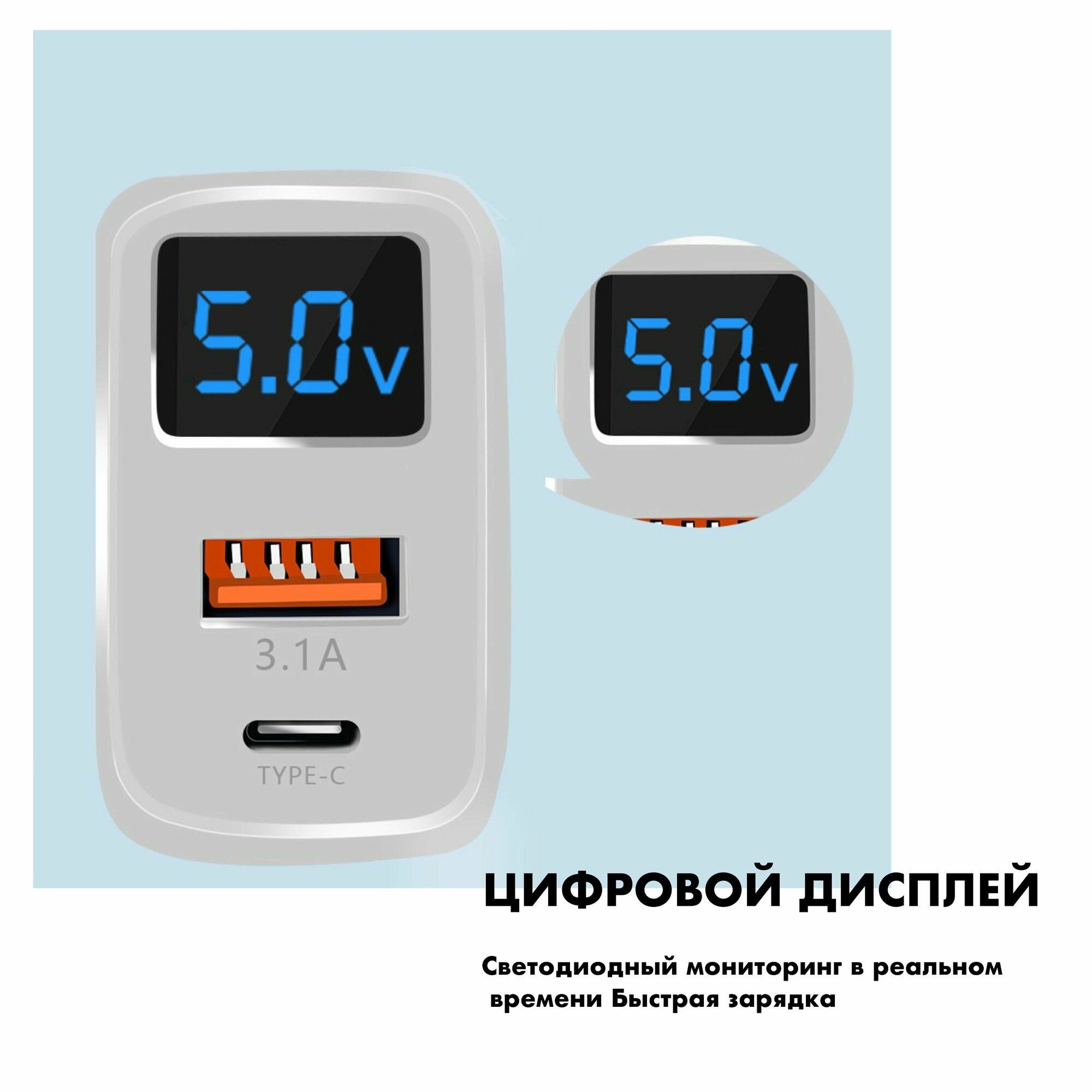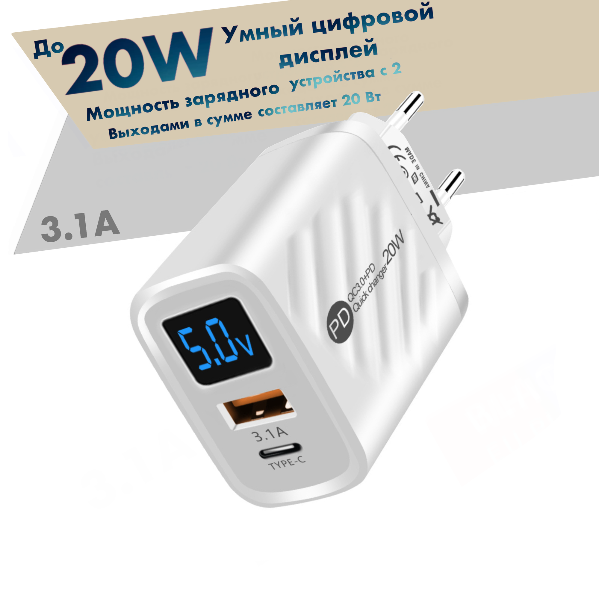 Зарядное устройство (адаптер) для телефона, планшета. 1 USB порт и 1 Type-C порт. 20W 5V 3.1A, с умным цифровым дисплеем/ белый цвет интересное: