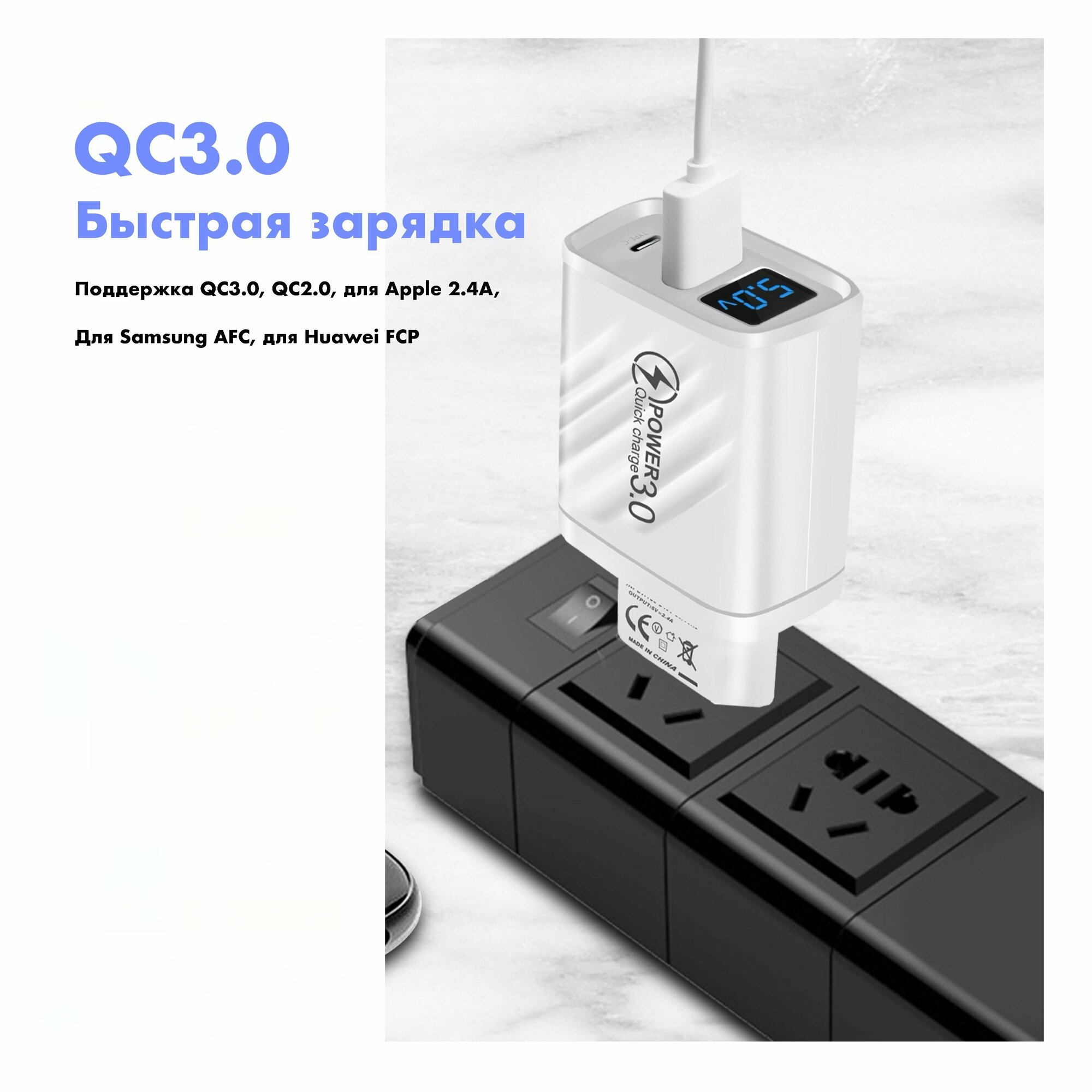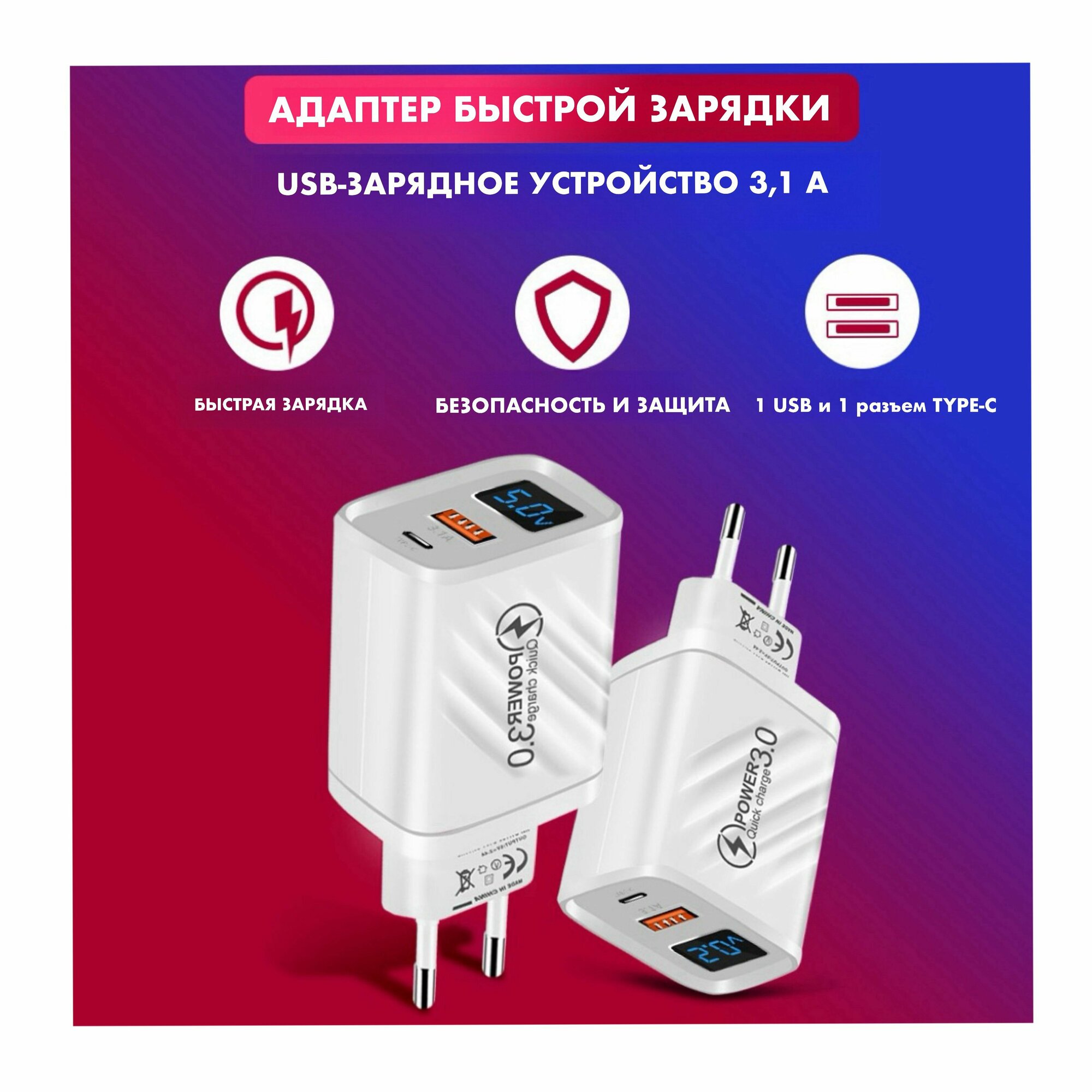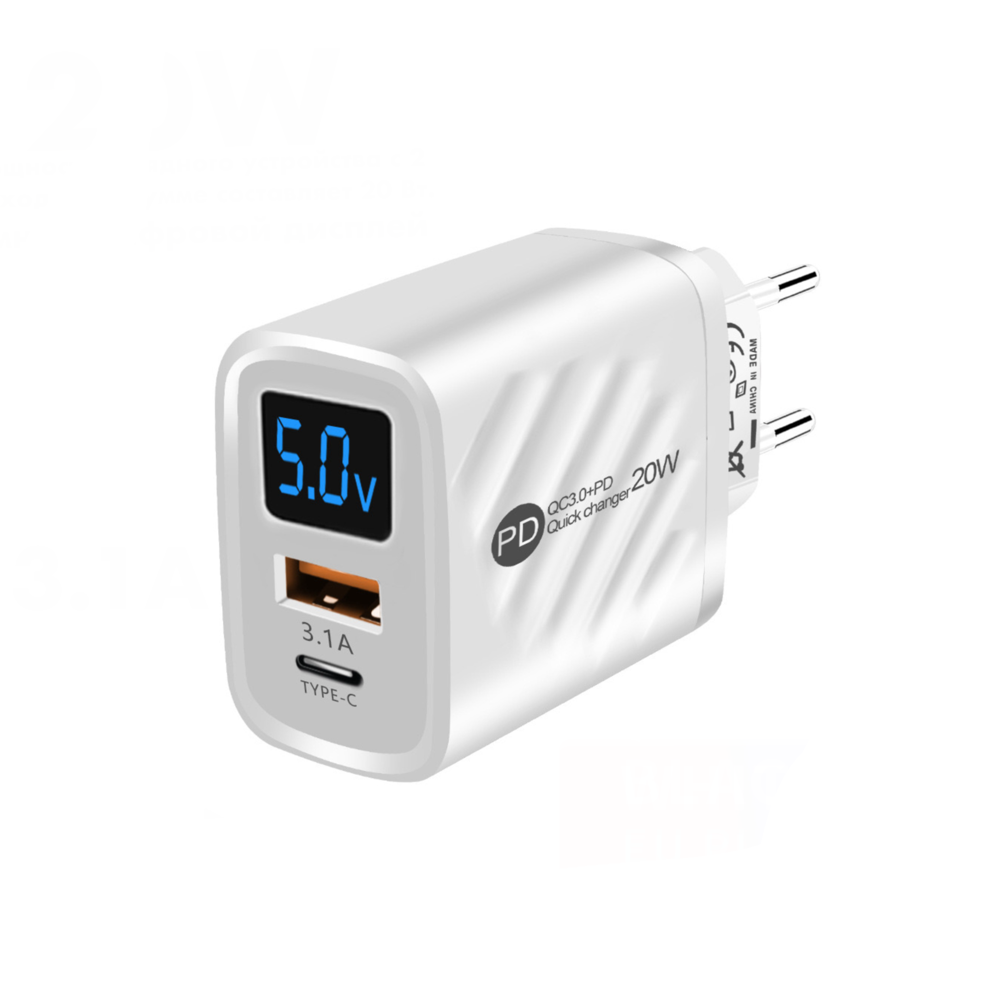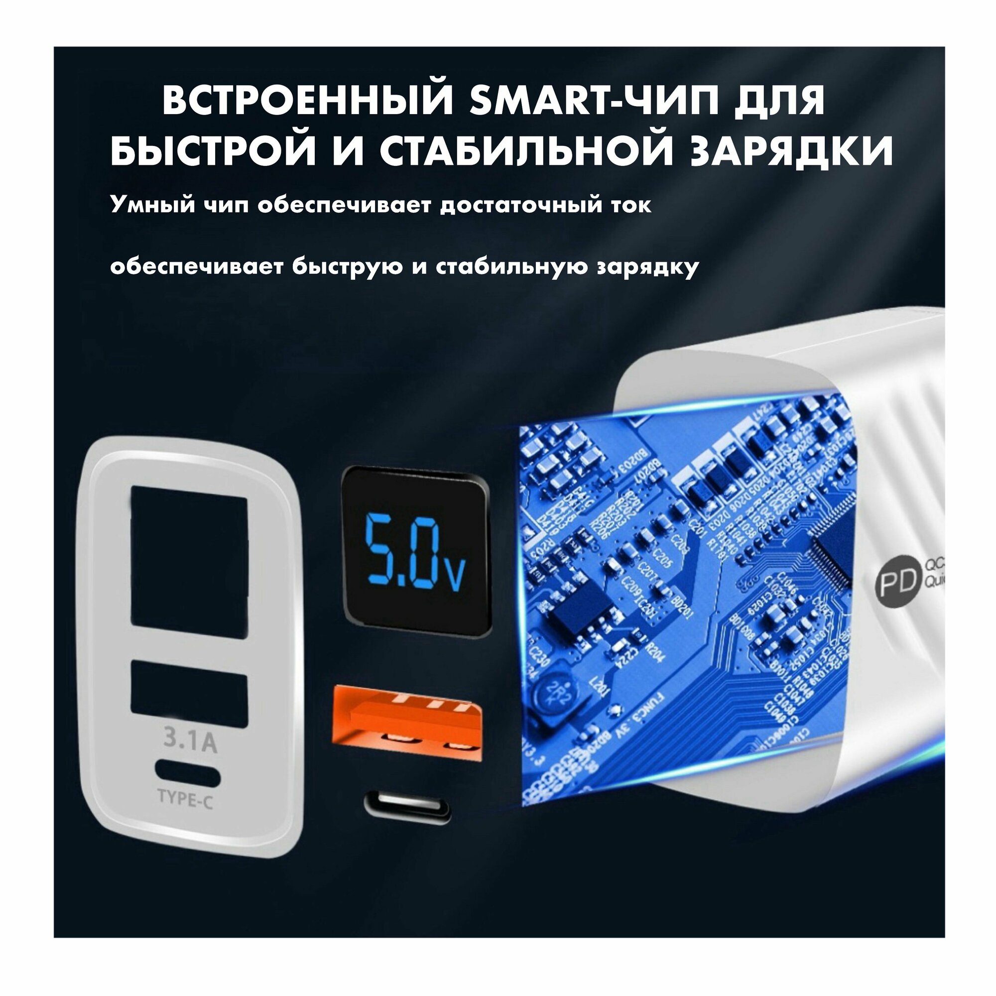 Зарядное устройство (адаптер) для телефона, планшета. 1 USB порт и 1 Type-C порт. 20W 5V 3.1A, с умным цифровым дисплеем/ белый цвет интересное: