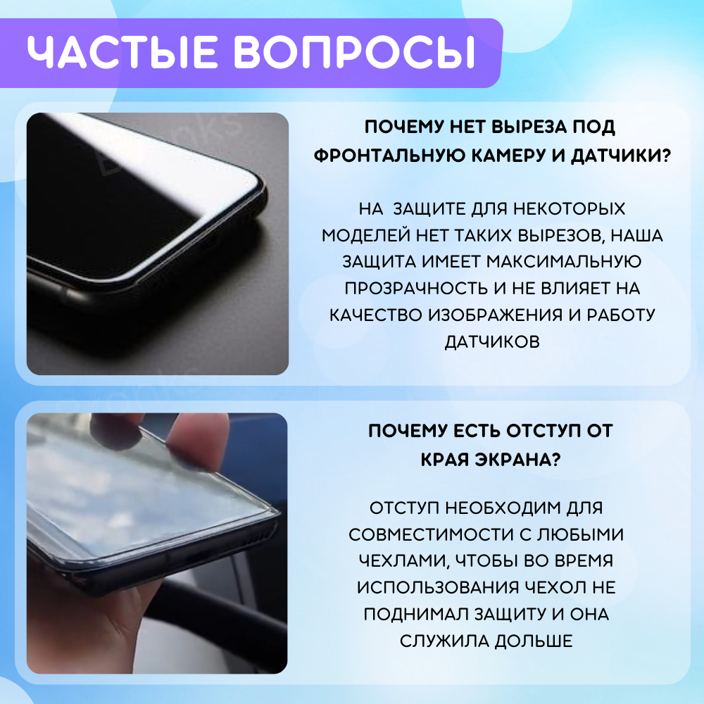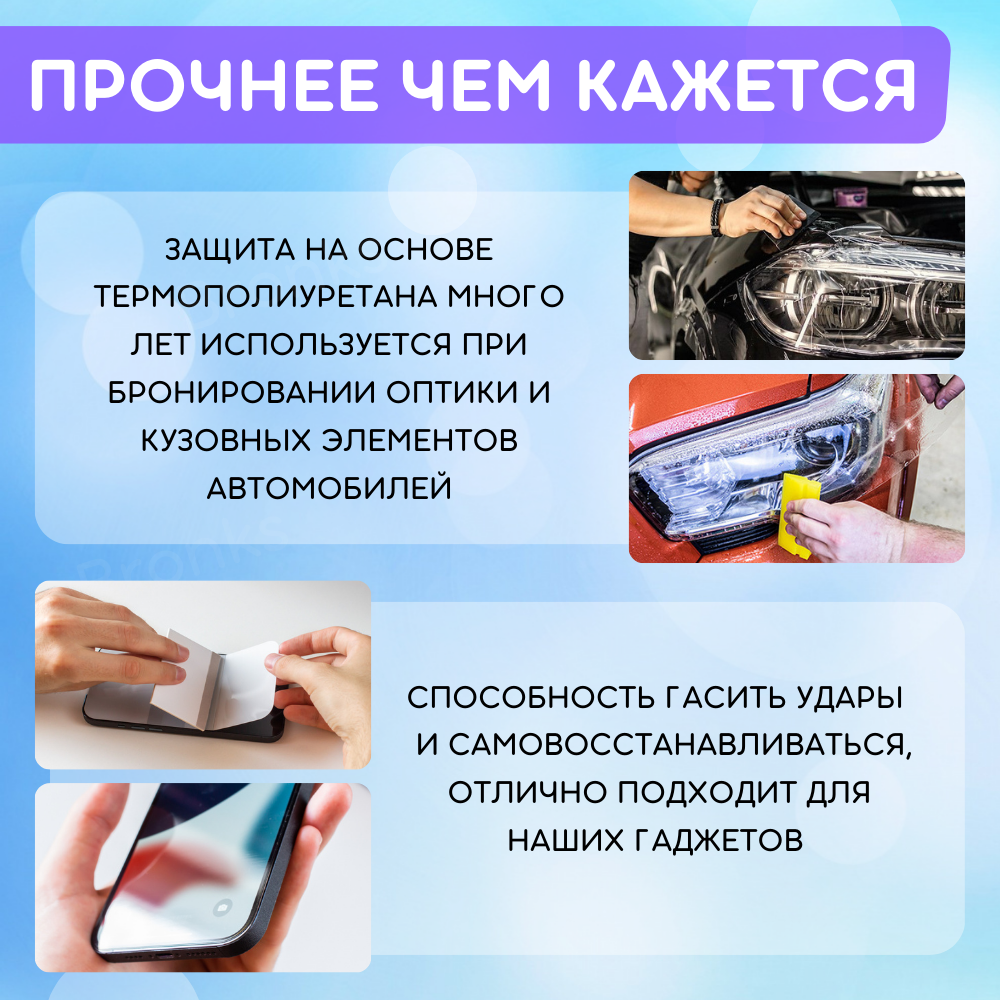 | Особенности | глянцевая поверхность / матовая поверхность / олеофобное покрытие / под чехол / прозрачность / самовосстанавливающаяся |