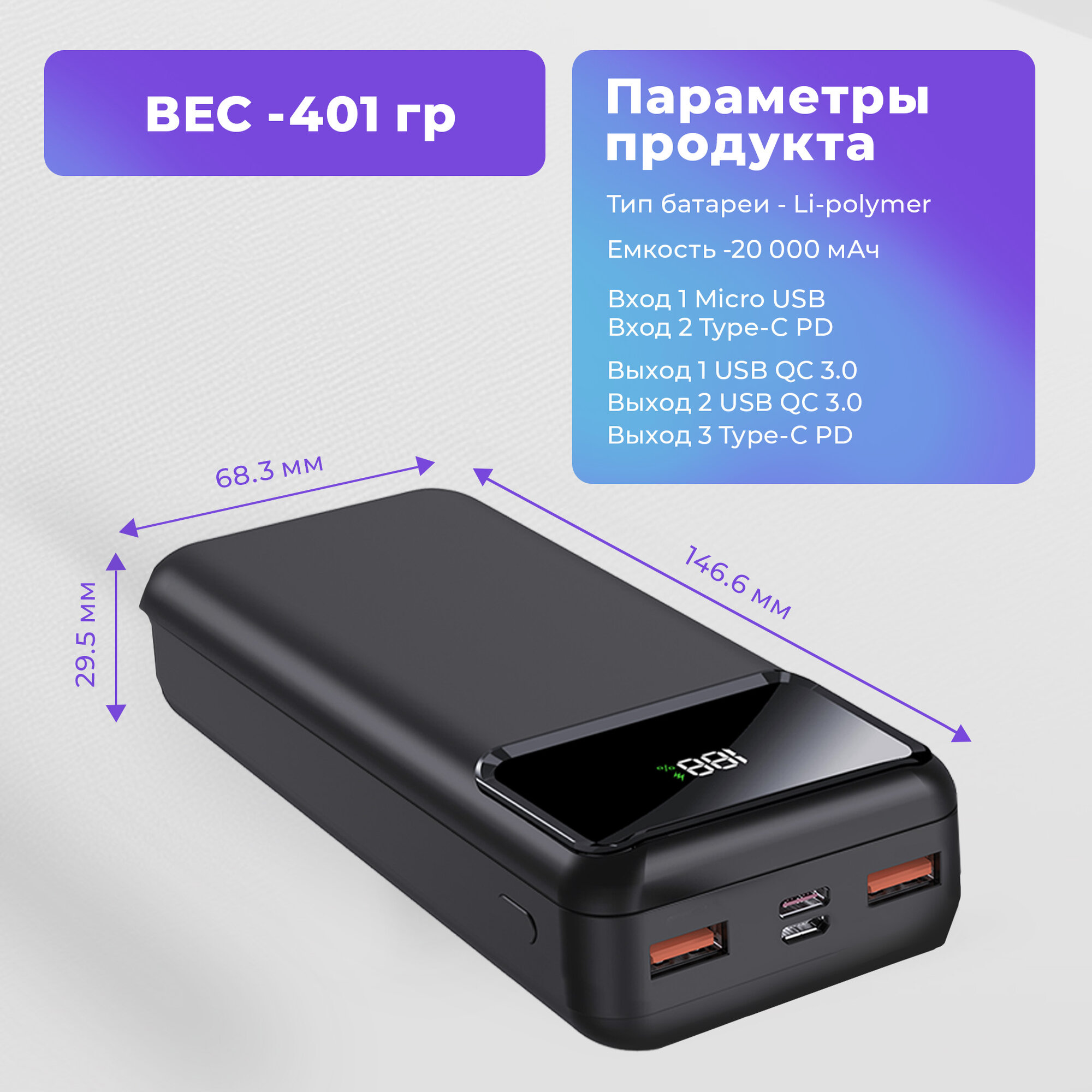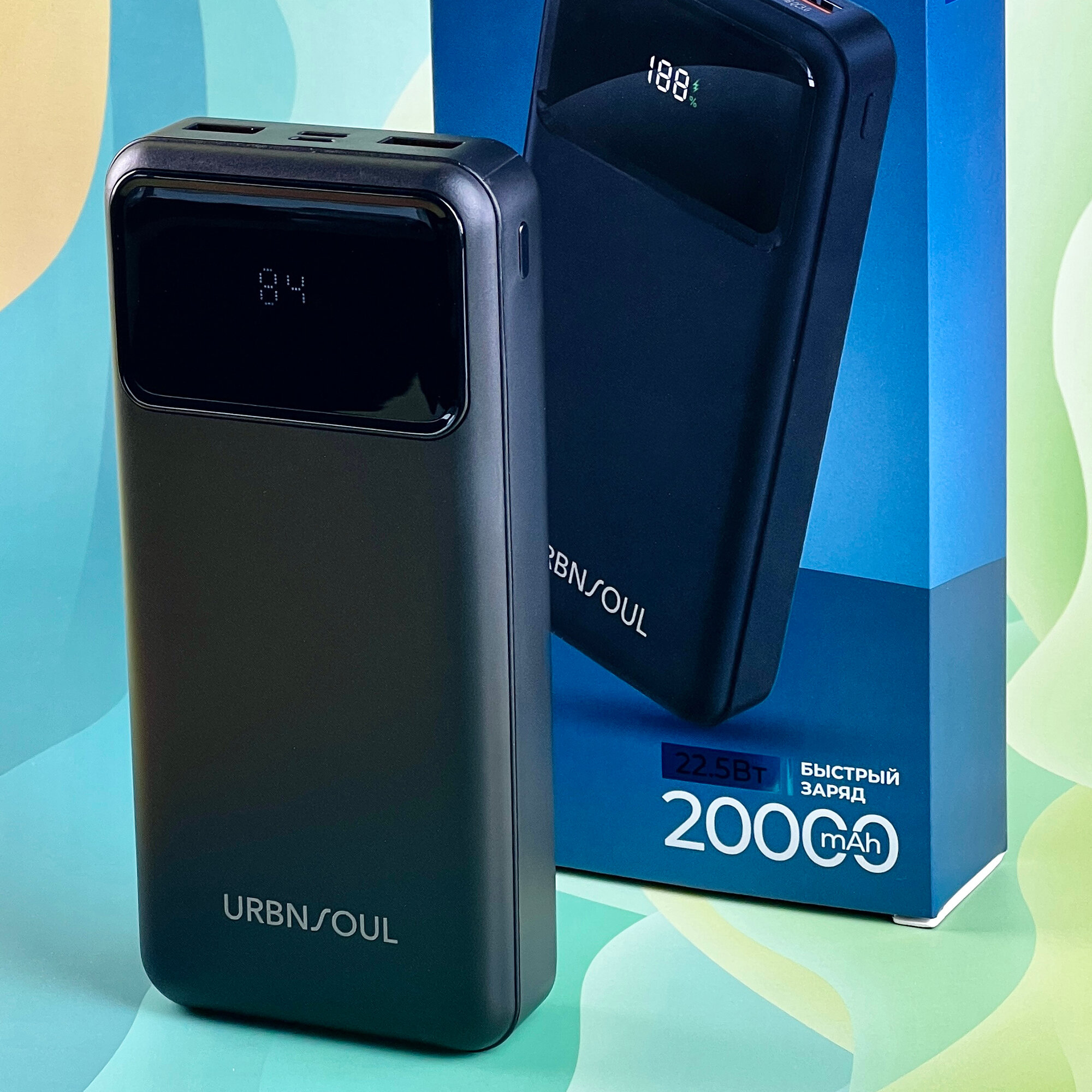 Повербанк, URBNSOUL, UPB-420, 20000 mAh, 2 USB и Type-C, черный // powerbank, пауэр банк, внешний аккумулятор, повербанк xiaomi, повербанк 20000 интересное: