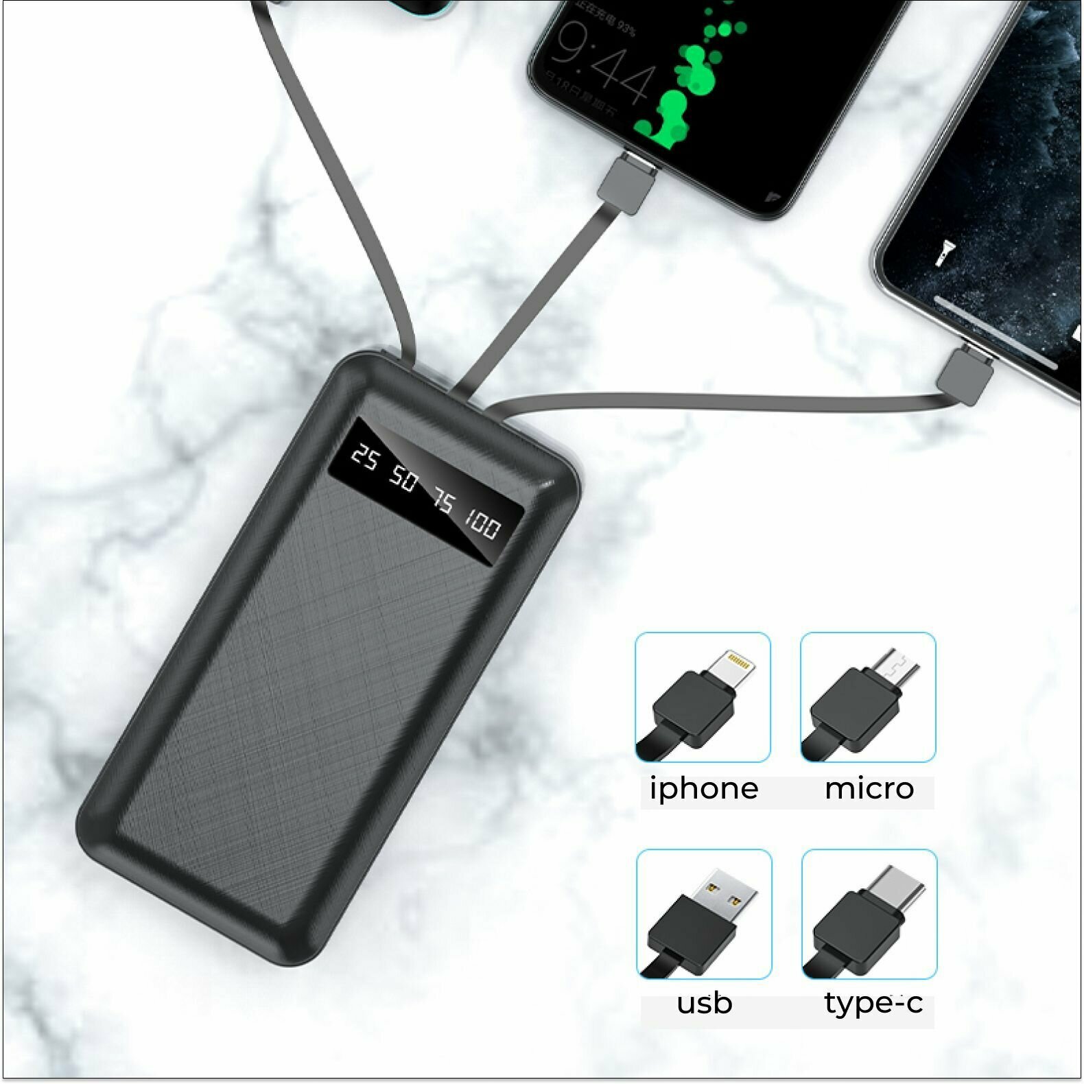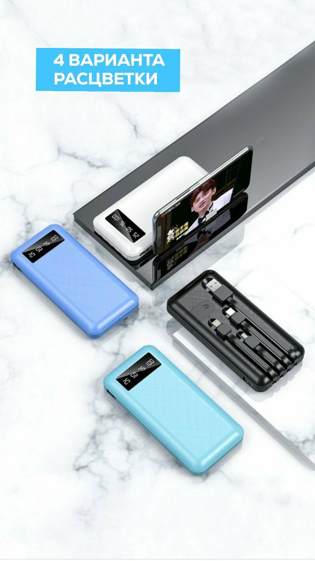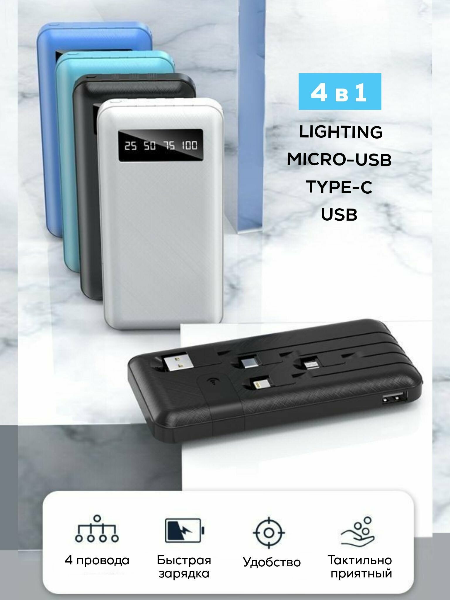 Портативный аккумулятор, повербанк 10 000 mAh, внешний аккумулятор со встроенными кабелями USB, Type-c, lightning, micro-usb интересное: