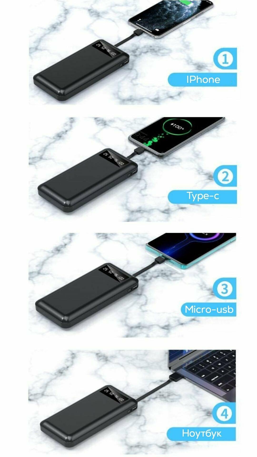 Ниже Вы можете прочитать отзывы на Портативный аккумулятор, повербанк 10 000 mAh, внешний аккумулятор со встроенными кабелями USB, Type-c, lightning, micro-usb, ознакомится с подробными характеристиками, посмотреть интересные обзоры и фотографии на Портативный аккумулятор, повербанк 10 000 mAh, внешний аккумулятор со встроенными кабелями USB, Type-c, lightning, micro-usb.