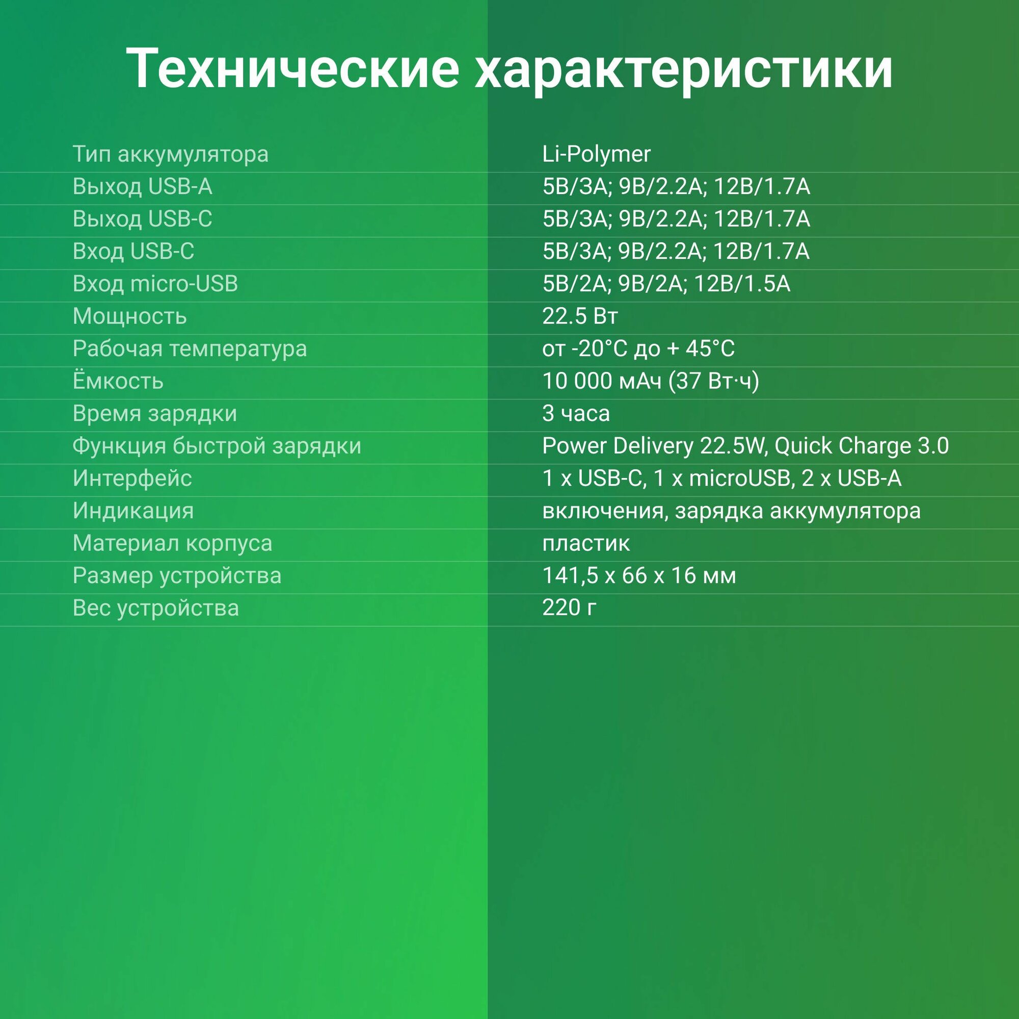 | Выходные разъемы | USB Type-A / USB Type-A x 2 / USB Type-C / micro USB |