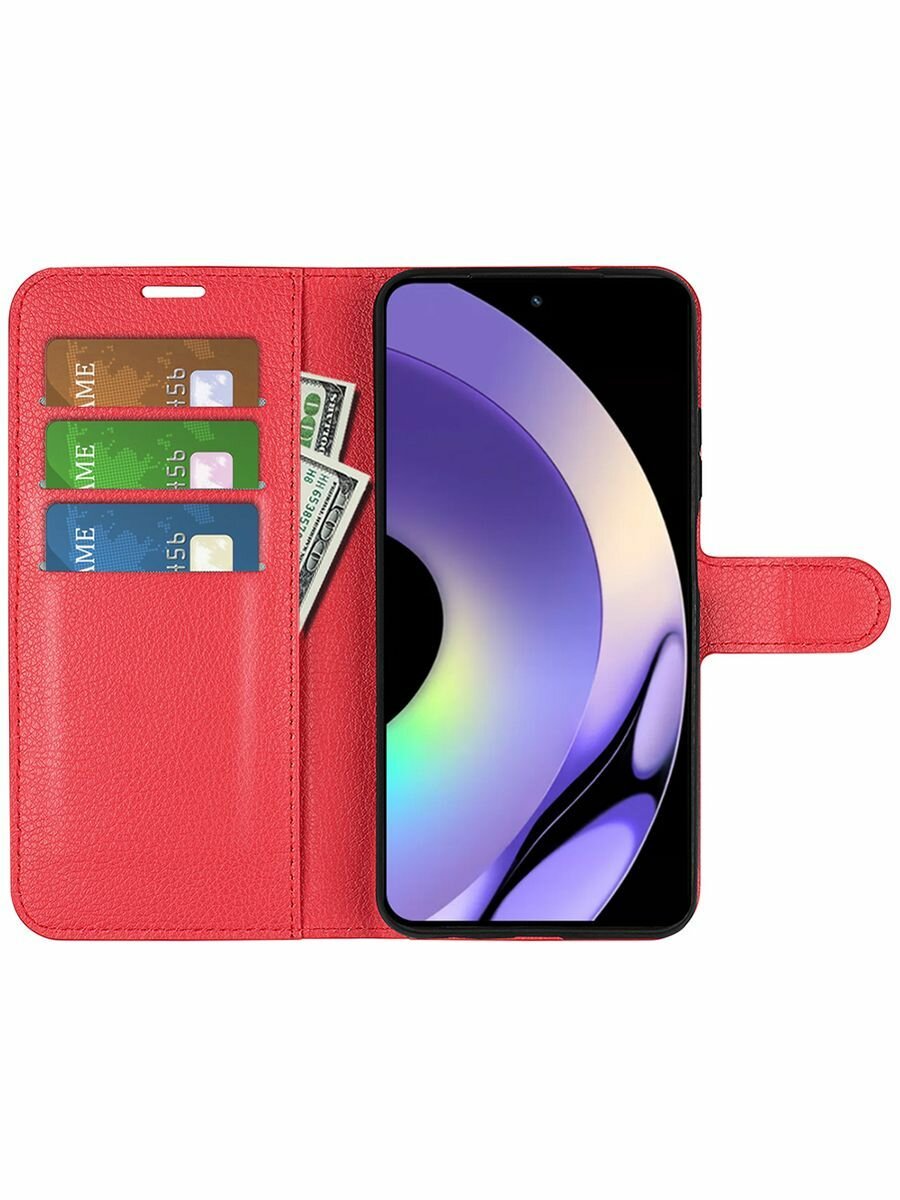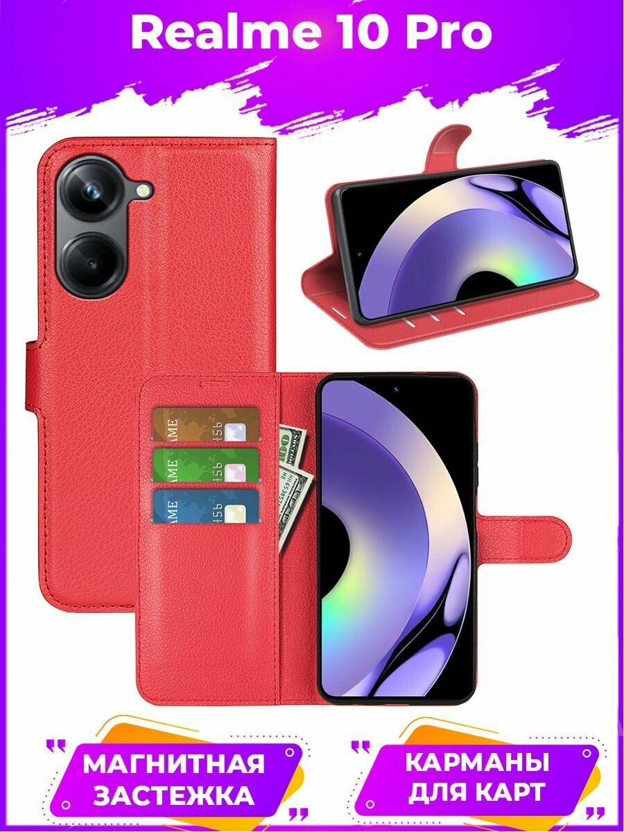 Wallet Чехол книжка с магнитом эко кожаный с карманом для карты на Realme 10 Pro красный интересное: