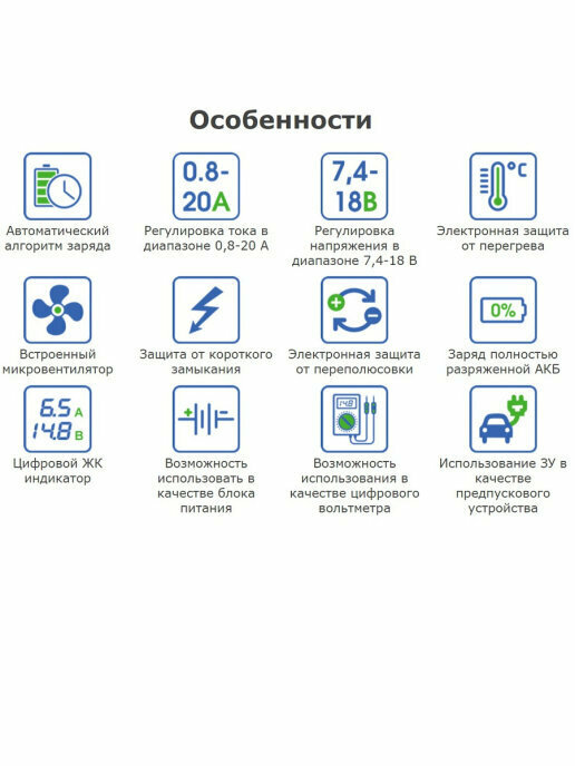 Сама определяет уставший акб и пытается его реанимировать. Можно использовать как отдельный блок питания, что полезно в домашней лаборатории. |